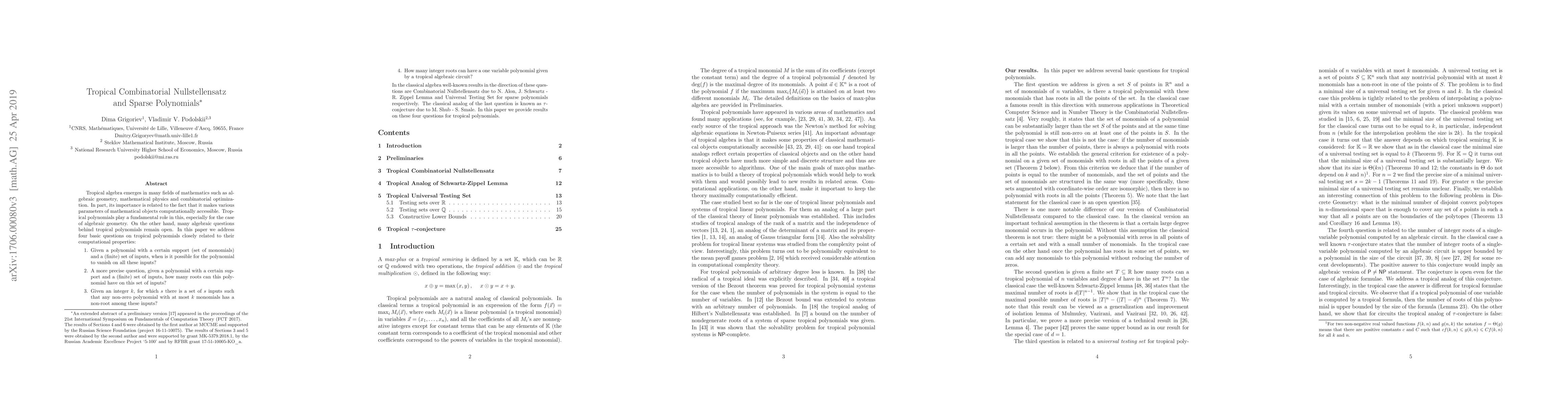 Tropical algebra emerges in many fields of mathematics such as algebraic geometry, mathematical physics and combinatorial optimization. In part, its importance is related to the fact that it makes various parameters of mathematical objects computationally accessible. Tropical polynomials play a fundamental role in this, especially for the case of algebraic geometry. On the other hand, many algebraic questions behind tropical polynomials remain open. In this paper we address four basic questions on tropical polynomials closely related to their computational properties: 1. Given a polynomial with a certain support (set of monomials) and a (finite) set of inputs, when is it possible for the polynomial to vanish on all these inputs? 2. A more precise question, given a polynomial with a certain support and a (finite) set of inputs, how many roots can this polynomial have on this set of inputs? 3. Given an integer $k$, for which $s$ there is a set of $s$ inputs such that any non-zero polynomial with at most $k$ monomials has a non-root among these inputs? 4. How many integer roots can have a one variable polynomial given by a tropical algebraic circuit? In the classical algebra well-known results in the direction of these questions are Combinatorial Nullstellensatz due to N. Alon, J. Schwartz - R. Zippel Lemma and Universal Testing Set for sparse polynomials respectively. The classical analog of the last question is known as $\tau$-conjecture due to M. Shub - S. Smale. In this paper we provide results on these four questions for tropical polynomials.