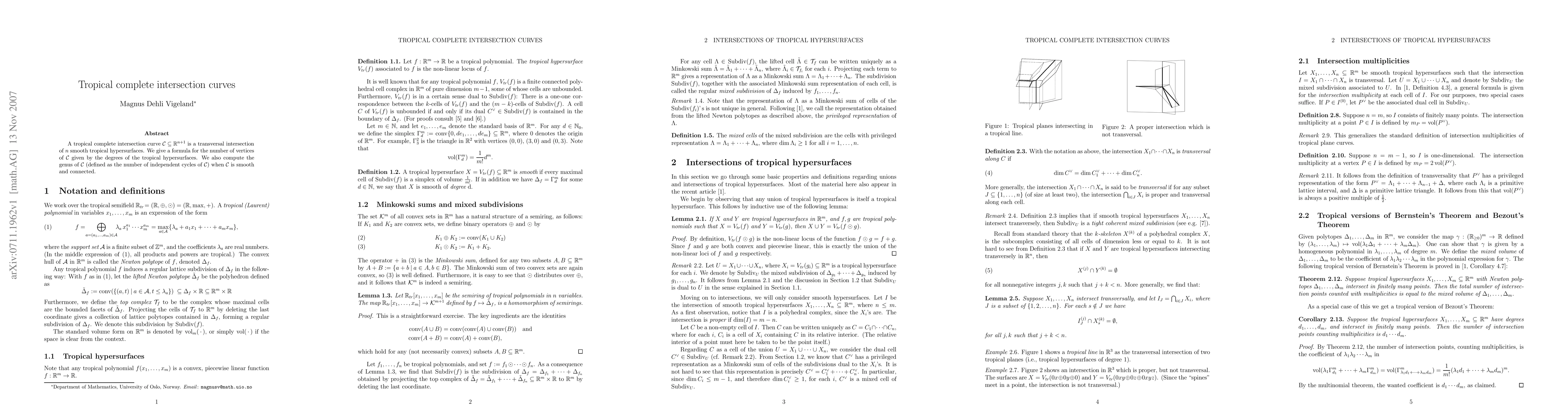 Tropical complete intersection curves in R^(n+1) are intersections of n smooth tropical hypersurfaces, and their vertex count is determined by the hypersurfaces' degrees. The genus of these smooth, connected curves is also calculated based on independent cycle counts.