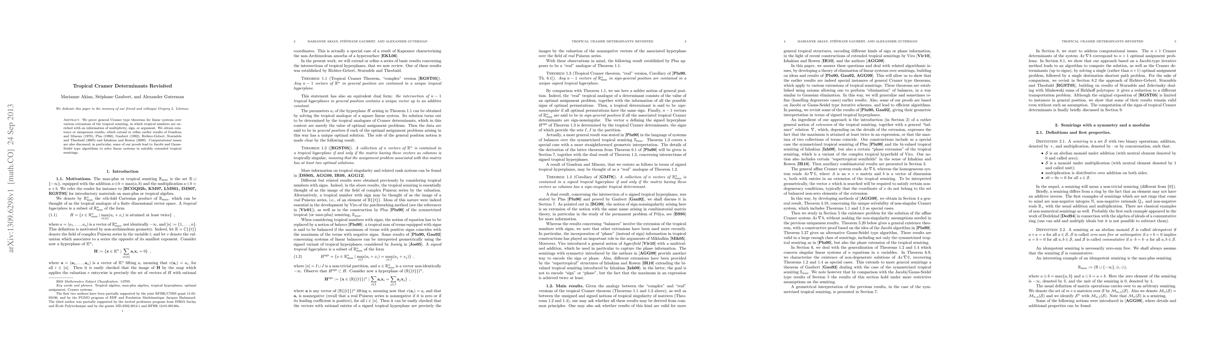 We prove general Cramer type theorems for linear systems over various extensions of the tropical semiring, in which tropical numbers are enriched with an information of multiplicity, sign, or argument. We obtain existence or uniqueness results, which extend or refine earlier results of Gondran and Minoux (1978), Plus (1990), Gaubert (1992), Richter-Gebert, Sturmfels and Theobald (2005) and Izhakian and Rowen (2009). Computational issues are also discussed; in particular, some of our proofs lead to Jacobi and Gauss-Seidel type algorithms to solve linear systems in suitably extended tropical semirings.