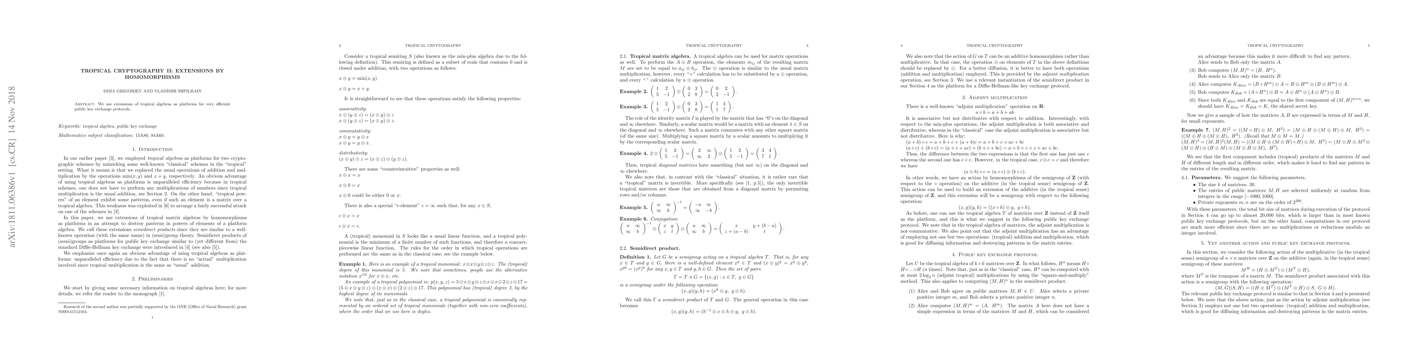We use extensions of tropical algebras as platforms for very efficient public key exchange protocols.