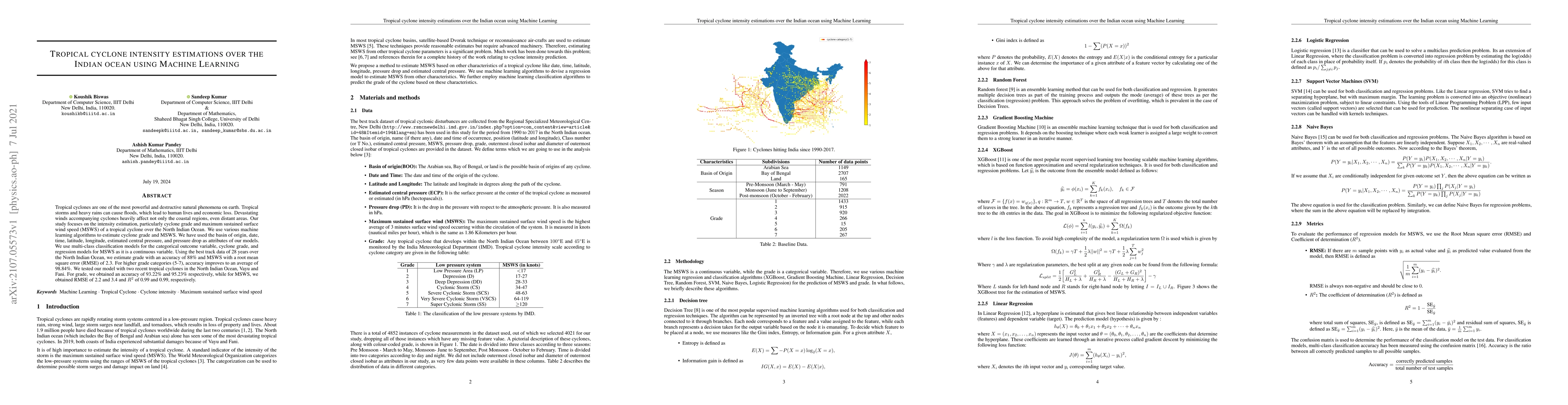 This study employs machine learning algorithms to estimate the intensity of tropical cyclones over the North Indian Ocean, focusing on cyclone grade and maximum sustained surface wind speed (MSWS). Using historical data, the model achieves 88% accuracy for cyclone grade and 2.3 RMSE for MSWS, with higher accuracy for severe grades. The model was validated with recent cyclones, showing high accuracy for grade and strong correlation for MSWS.