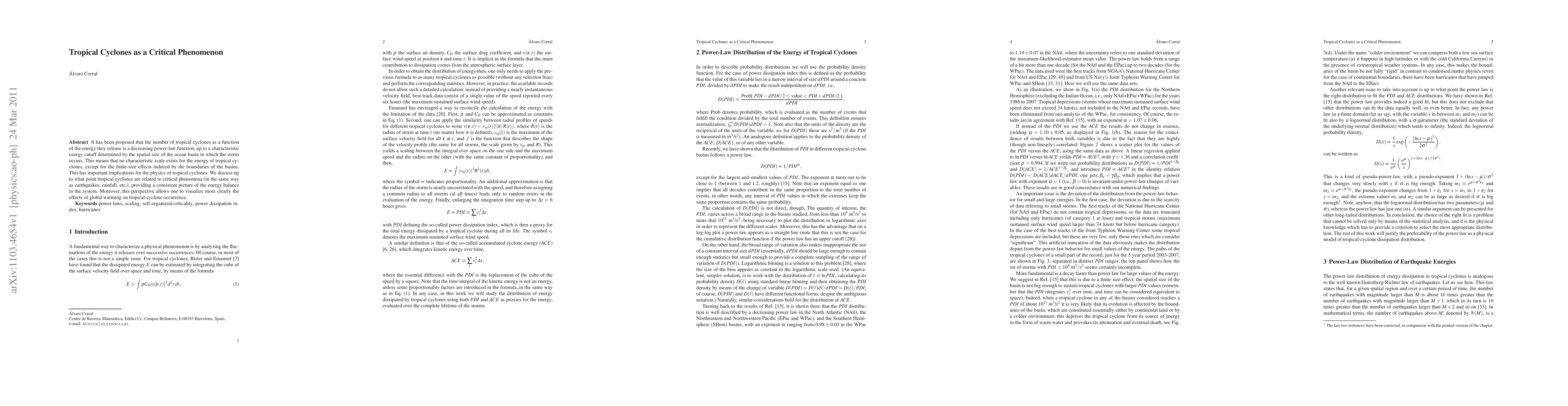 This paper explores the relationship between tropical cyclones and critical phenomena, proposing that their energy distribution follows a decreasing power-law function up to a basin-specific cutoff. It highlights the implications for understanding tropical cyclones and their potential link to global warming.