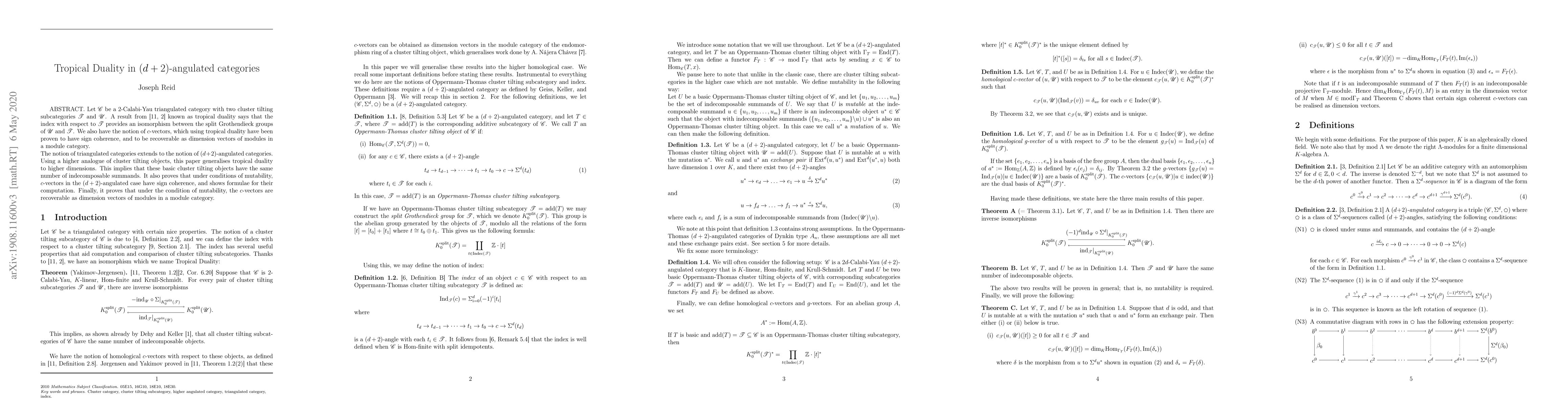 Let $\mathscr{C}$ be a $2$-Calabi-Yau triangulated category with two cluster tilting subcategories $\mathscr{T}$ and $\mathscr{U}$. Results by Demonet-Iyama-Jasso and J{\o}rgensen-Yakimov known as tropical duality says that the index with respect to $\mathscr{T}$ provides an isomorphism between the split Grothendieck groups of $\mathscr{U}$ and $\mathscr{T}$. We also have the notion of $c$-vectors, which using tropical duality have been proven to have sign coherence, and to be recoverable as dimension vectors of modules in a module category. The notion of triangulated categories extends to the notion of $(d+2)$-angulated categories. Using a higher analogue of cluster tilting objects, this paper generalises tropical duality to higher dimensions. This implies that these basic cluster tilting objects have the same number of indecomposable summands. It also proves that under conditions of mutability, $c$-vectors in the $(d+2)$-angulated case have sign coherence, and shows formulae for their computation. Finally, it proves that under the condition of mutability, the $c$-vectors are recoverable as dimension vectors of modules in a module category.