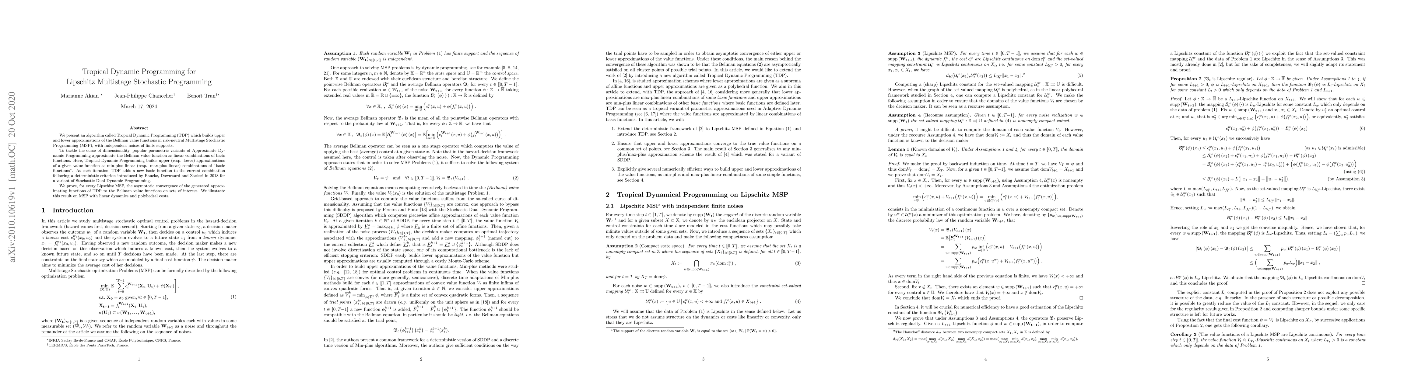 Tropical Dynamic Programming (TDP) introduces an algorithm to approximate Bellman value functions in Lipschitz Multistage Stochastic Programming using min-plus and max-plus linear combinations. The method demonstrates asymptotic convergence to the true Bellman value functions, illustrated through linear dynamics and polyhedral costs.