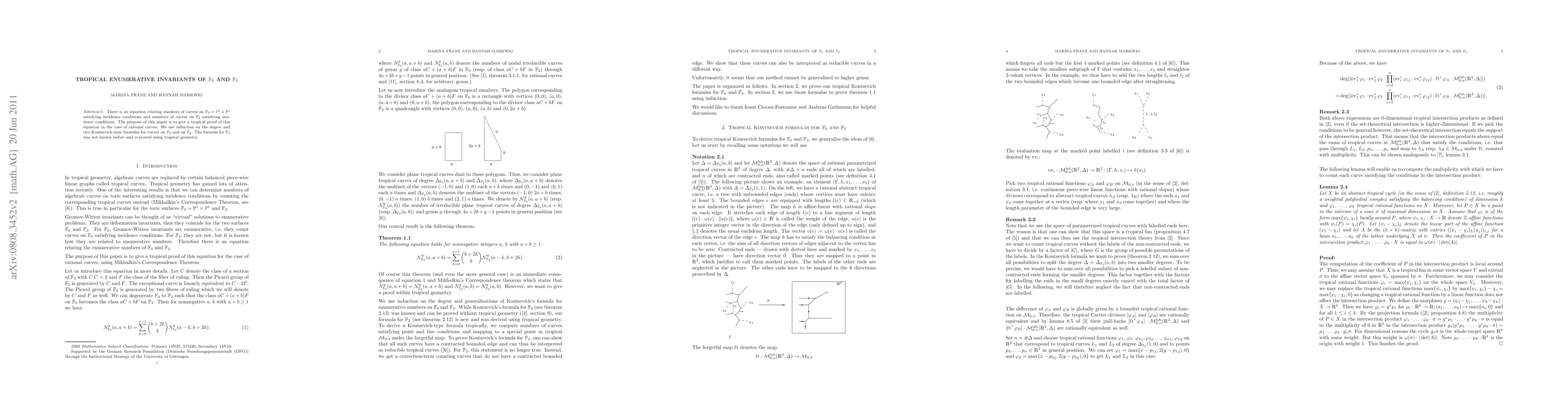 There is an equation relating numbers of curves on F_0 satisfying incidence conditions and numbers of curves on F_2 satisfying incidence conditions. The purpose of this paper is to give a tropical proof of this equation in the case of rational curves. We use induction on the degree and two Kontsevich-type formulas for curves on F_0 and on F_2. The formula for F_2 was not known before and is proved using tropical geometry.