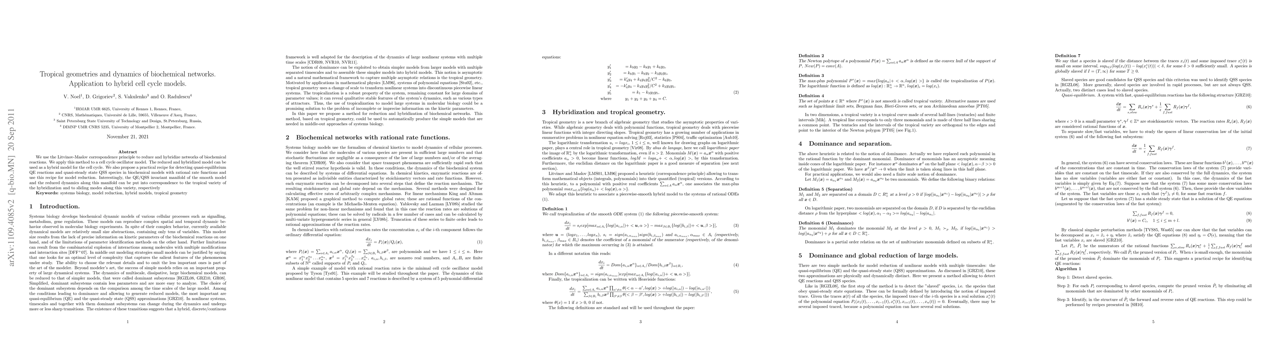 Summary: This paper employs the Litvinov-Maslov correspondence to reduce and hybridize biochemical networks, specifically applying it to a cell cycle oscillator model. It proposes a method for detecting quasi-equilibrium and quasi-steady state elements, linking these to the tropical variety and sliding modes in the hybridized model.