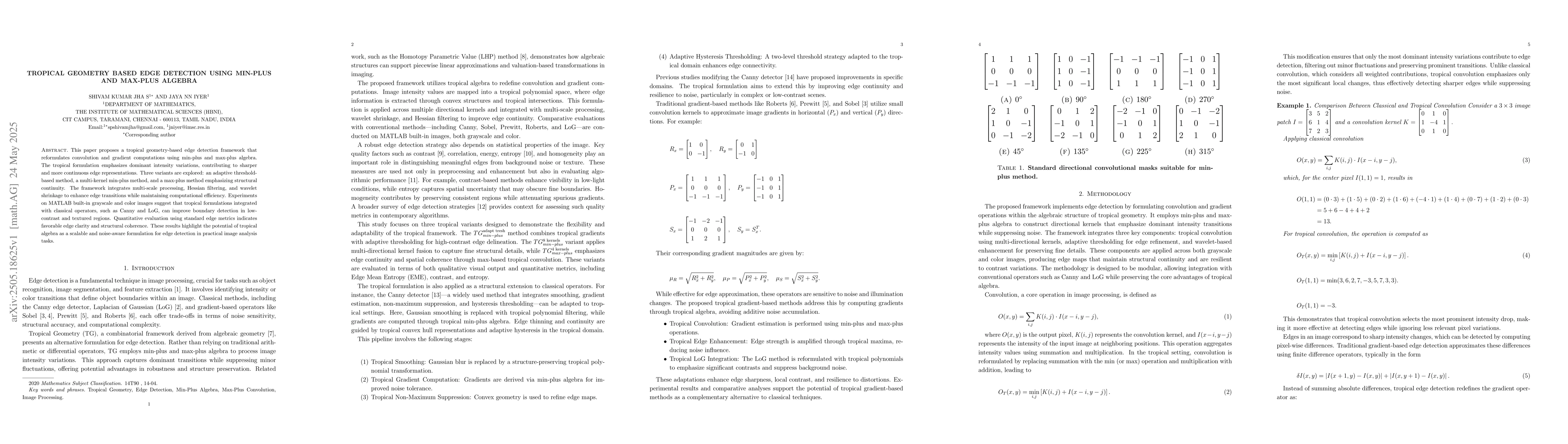 The research proposes a tropical geometry-based edge detection framework using min-plus and max-plus algebra, reformulating convolution and gradient computations. It explores three variants: adaptive threshold-based, multi-kernel min-plus, and max-plus methods, integrating multi-scale processing, Hessian filtering, and wavelet shrinkage.