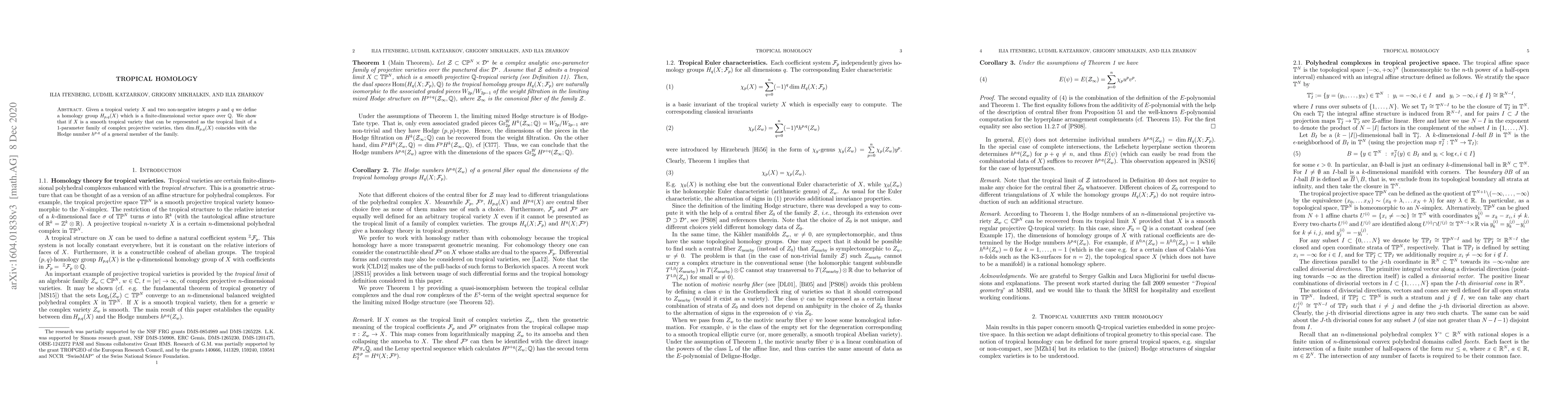 The paper defines a tropical homology group $H_{p,q}(X)$ for smooth tropical varieties and demonstrates its equivalence to the Hodge number $h^{p,q}$ of complex projective varieties in a 1-parameter family to which the tropical variety converges.