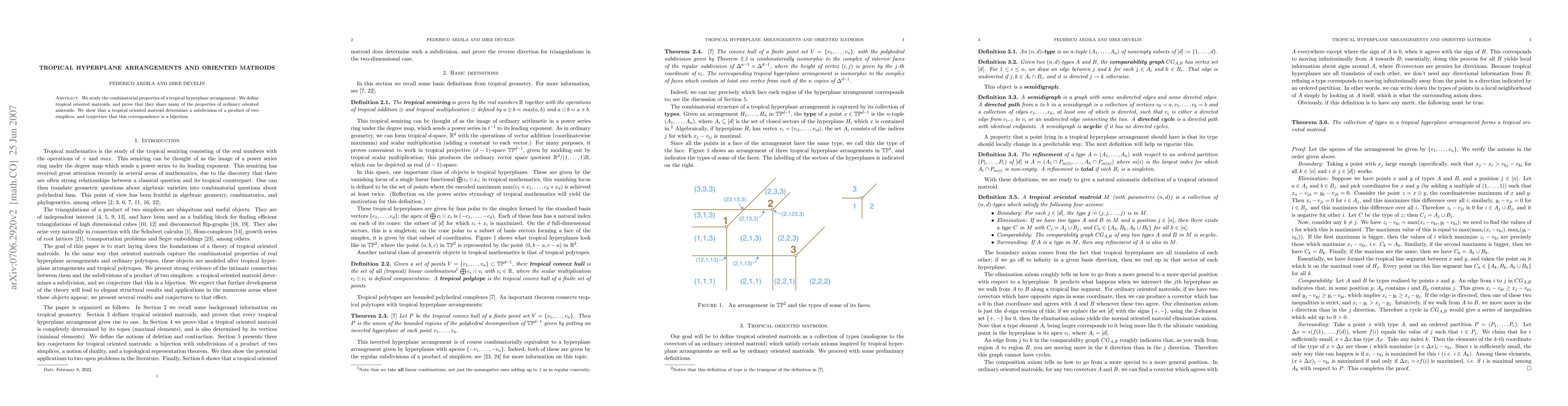 The paper studies tropical hyperplane arrangements and defines tropical oriented matroids, proving they share properties with ordinary oriented matroids. It establishes a correspondence between tropical oriented matroids and subdivisions of a product of simplices, conjecturing this correspondence is a bijection.