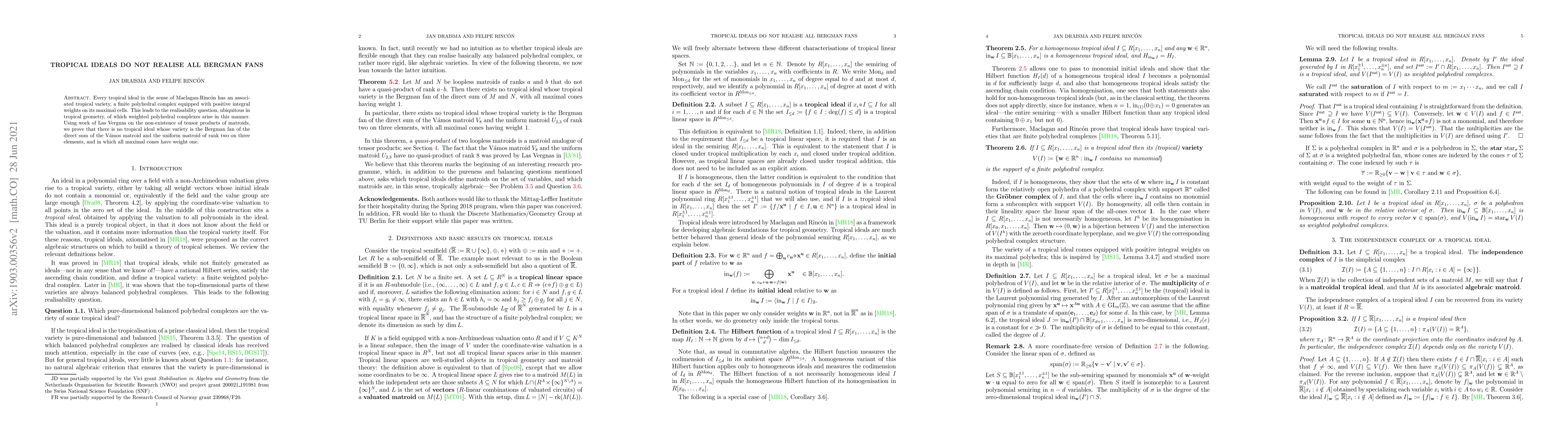 This paper demonstrates that not all Bergman fans can be realized by tropical ideals, specifically showing that the Bergman fan of the direct sum of the Vámos matroid and a rank two uniform matroid on three elements cannot be realized by any tropical ideal with all maximal cones having weight one. This conclusion leverages results from the theory of tensor products of matroids.