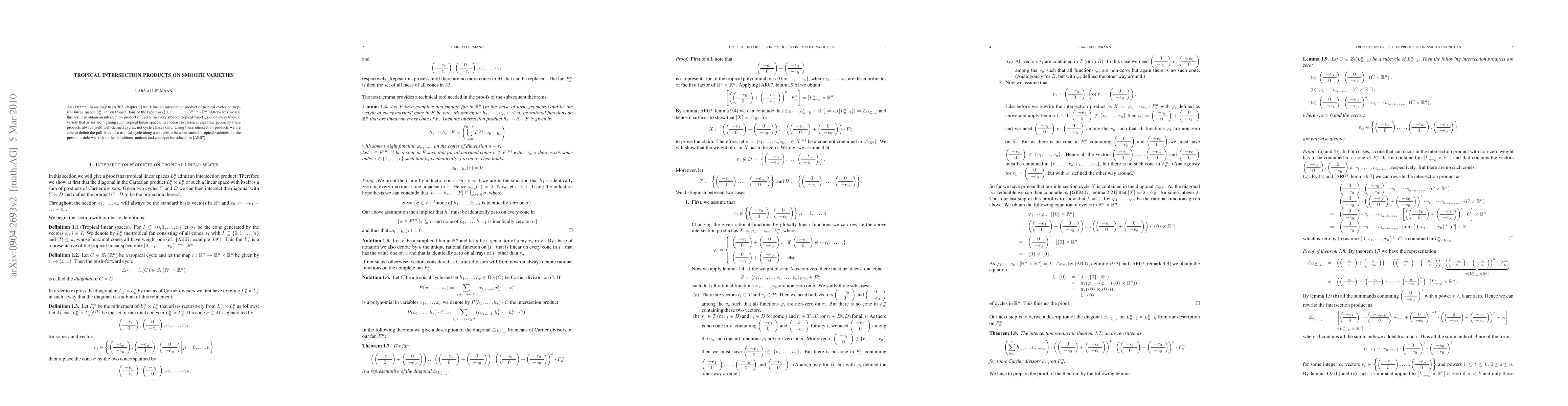 The paper defines an intersection product of tropical cycles on tropical linear spaces and extends this to smooth tropical varieties, utilizing Cartier divisors and local intersection products.