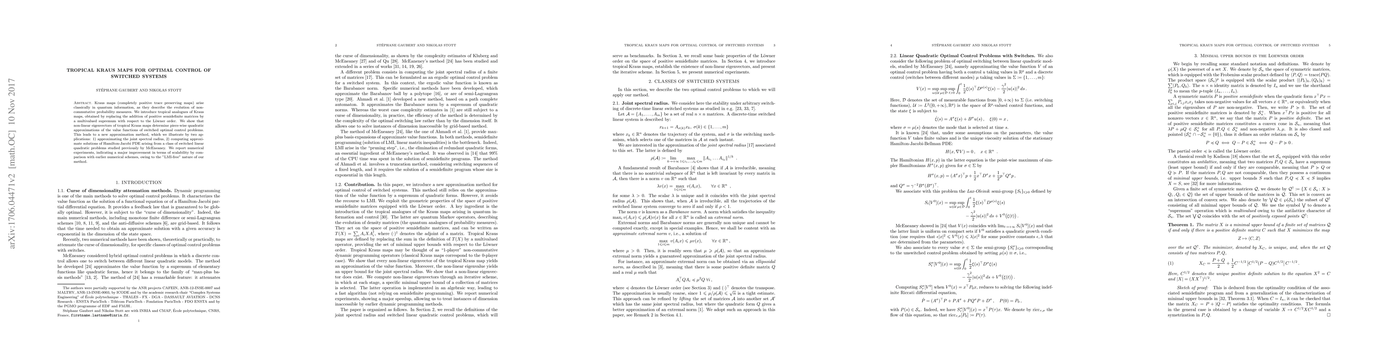 Kraus maps (completely positive trace preserving maps) arise classically in quantum information, as they describe the evolution of noncommutative probability measures. We introduce tropical analogues of Kraus maps, obtained by replacing the addition of positive semidefinite matrices by a multivalued supremum with respect to the L\"owner order. We show that non-linear eigenvectors of tropical Kraus maps determine piecewise quadratic approximations of the value functions of switched optimal control problems. This leads to a new approximation method, which we illustrate by two applications: 1) approximating the joint spectral radius, 2) computing approximate solutions of Hamilton-Jacobi PDE arising from a class of switched linear quadratic problems studied previously by McEneaney. We report numerical experiments, indicating a major improvement in terms of scalability by comparison with earlier numerical schemes, owing to the "LMI-free" nature of our method.