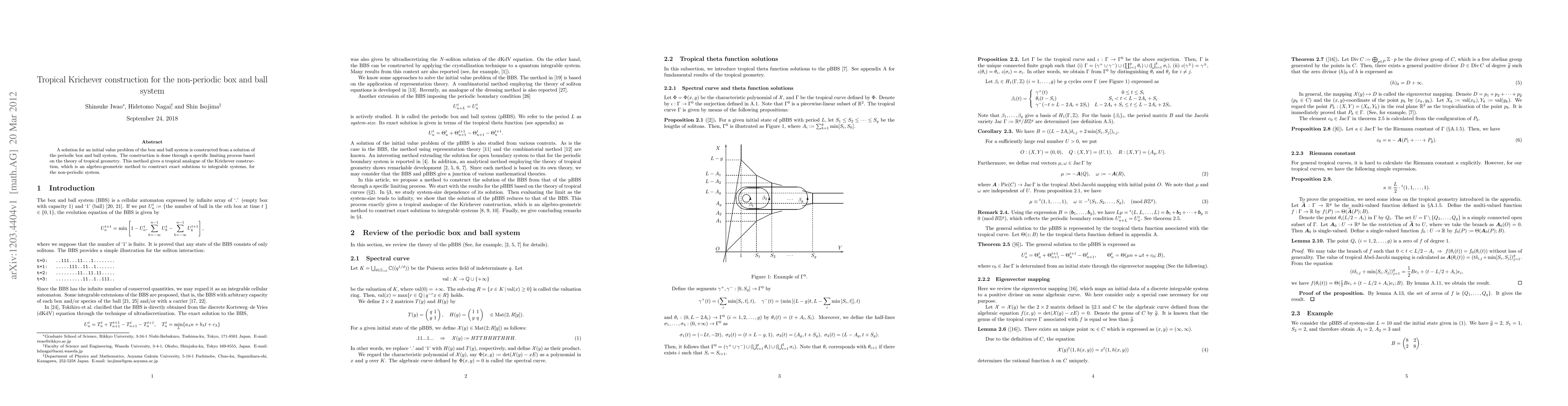 This paper constructs a solution for the non-periodic box and ball system using a tropical analogue of the Krichever construction, derived through a limiting process based on tropical geometry from the periodic system's solution. The method provides an algebro-geometric approach to integrable systems.