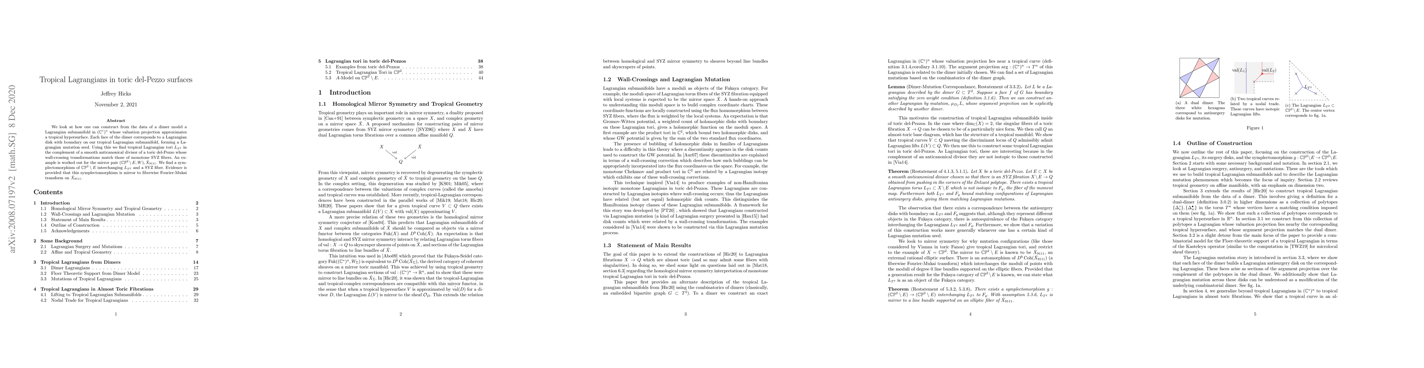 We look at how one can construct from the data of a dimer model a Lagrangian submanifold in $(\mathbb{C}^*)^n$ whose valuation projection approximates a tropical hypersurface. Each face of the dimer corresponds to a Lagrangian disk with boundary on our tropical Lagrangian submanifold, forming a Lagrangian mutation seed. Using this we find tropical Lagrangian tori $L_{T^2}$ in the complement of a smooth anticanonical divisor of a toric del-Pezzo whose wall-crossing transformations match those of monotone SYZ fibers. An example is worked out for the mirror pair $(\mathbb{CP}^2\setminus E, W), \check X_{9111}$. We find a symplectomorphism of $\mathbb{CP}^2\setminus E$ interchanging $L_{T^2}$ and a SYZ fiber. Evidence is provided that this symplectomorphism is mirror to fiberwise Fourier-Mukai transform on $\check X_{9111}$.