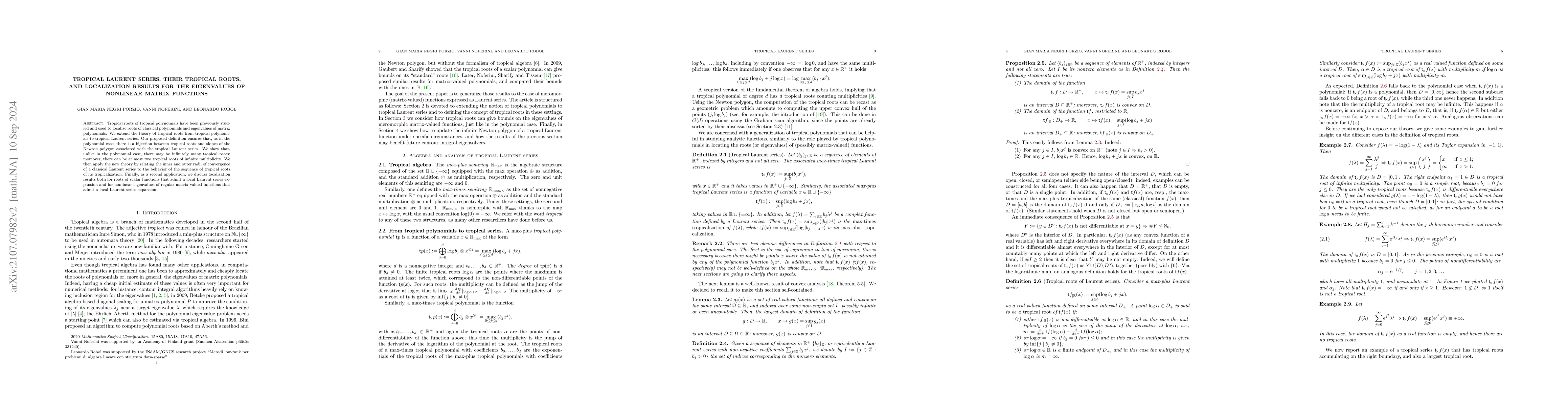 This research extends tropical roots theory from polynomials to Laurent series, establishing a bijection with Newton polygon slopes. It reveals that unlike polynomials, Laurent series can have infinitely many tropical roots, with at most two of infinite multiplicity. The findings are applied to relate classical Laurent series convergence radii with tropical root sequences and to obtain localization results for nonlinear eigenvalues of matrix functions.