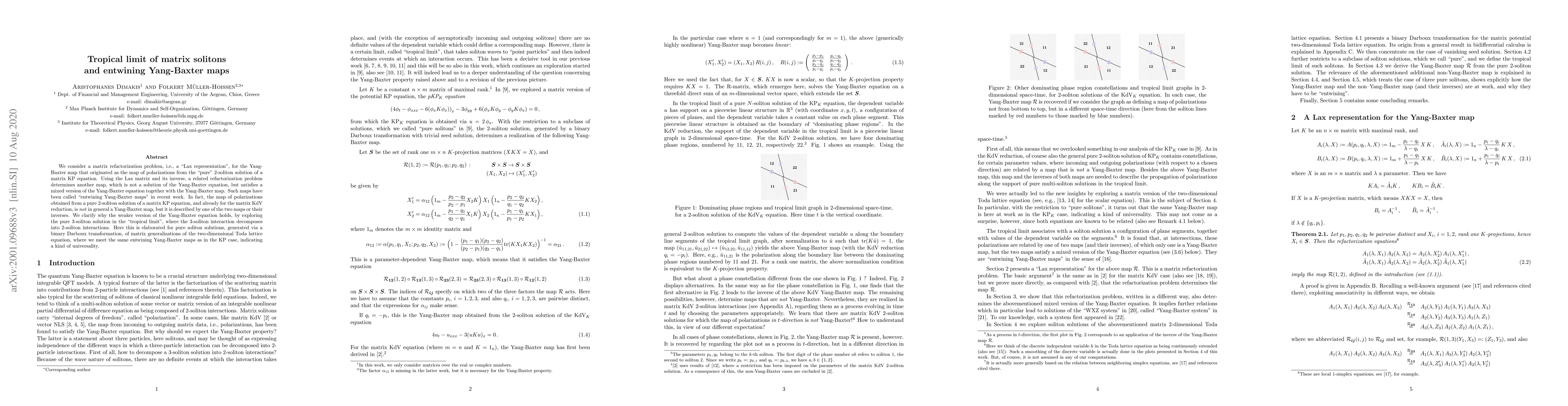 The paper investigates matrix refactorizations associated with the Yang-Baxter map arising from a pure 2-soliton solution of a matrix KP equation. It reveals that the resulting maps are "entwining Yang-Baxter maps" satisfying a mixed version of the Yang-Baxter equation, and explores the tropical limit of pure 3-soliton interactions to explain the weaker form of this equation.
