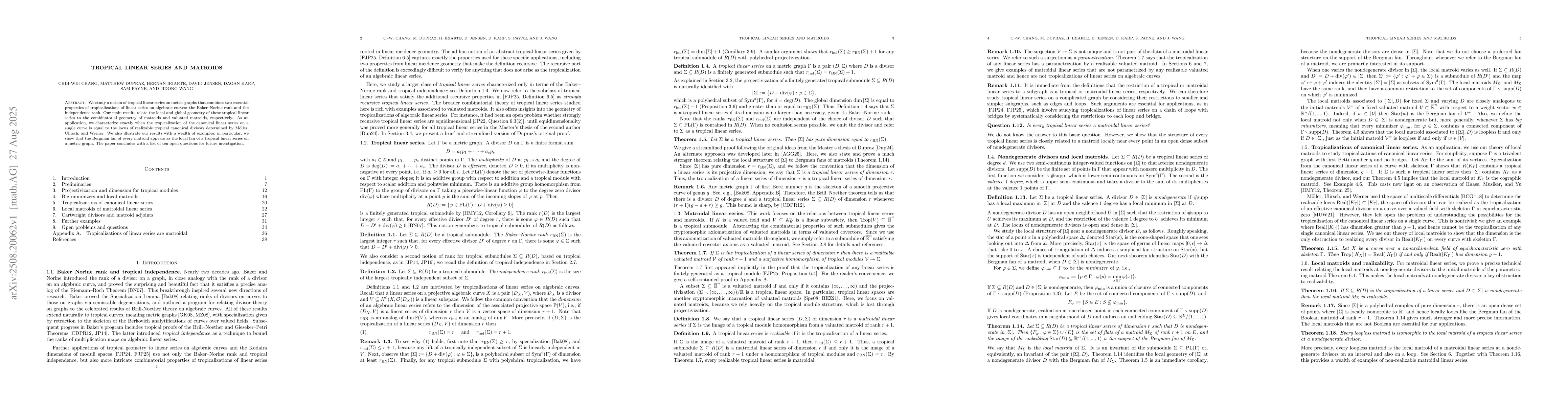 We study a notion of tropical linear series on metric graphs that combines two essential properties of tropicalizations of linear series on algebraic curves: the Baker-Norine rank and the independence rank. Our main results relate the local and global geometry of these tropical linear series to the combinatorial geometry of matroids and valuated matroids, respectively. As an application, we characterize exactly when the tropicalization of the canonical linear series on a single curve is equal to the locus of realizable tropical canonical divisors determined by M\"oller, Ulirsch, and Werner. We also illustrate our results with a wealth of examples; in particular, we show that the Bergman fan of every matroid appears as the local fan of a tropical linear series on a metric graph. The paper concludes with a list of ten open questions for future investigation.