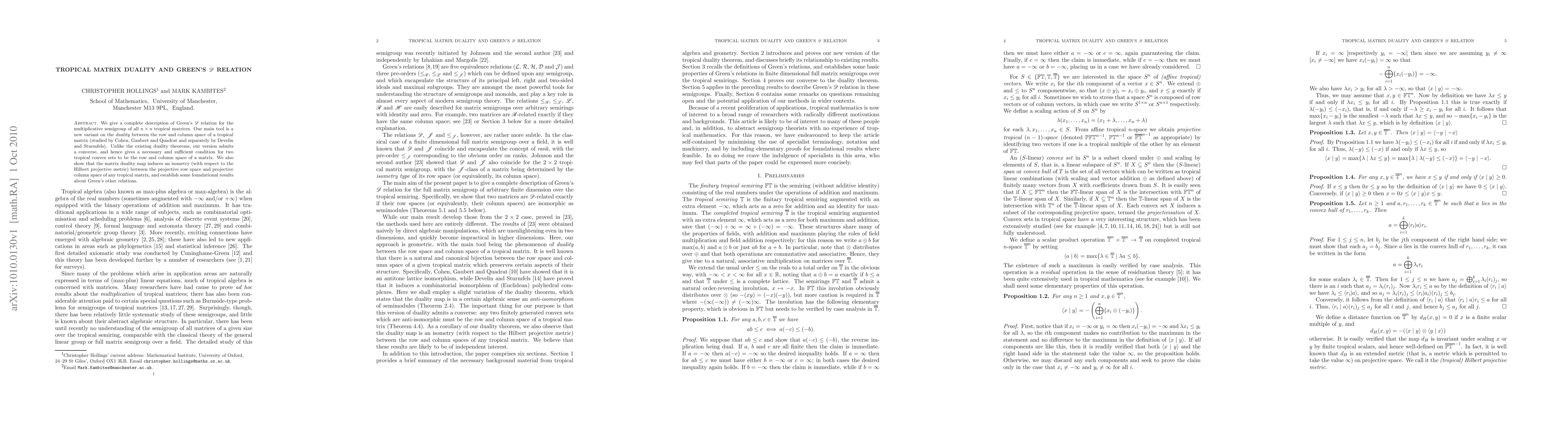 We give a complete description of Green's D relation for the multiplicative semigroup of all n-by-n tropical matrices. Our main tool is a new variant on the duality between the row and column space of a tropical matrix (studied by Cohen, Gaubert and Quadrat and separately by Develin and Sturmfels). Unlike the existing duality theorems, our version admits a converse, and hence gives a necessary and sufficient condition for two tropical convex sets to be the row and column space of a matrix. We also show that the matrix duality map induces an isometry (with respect to the Hilbert projective metric) between the projective row space and projective column space of any tropical matrix, and establish some foundational results about Green's other relations.
