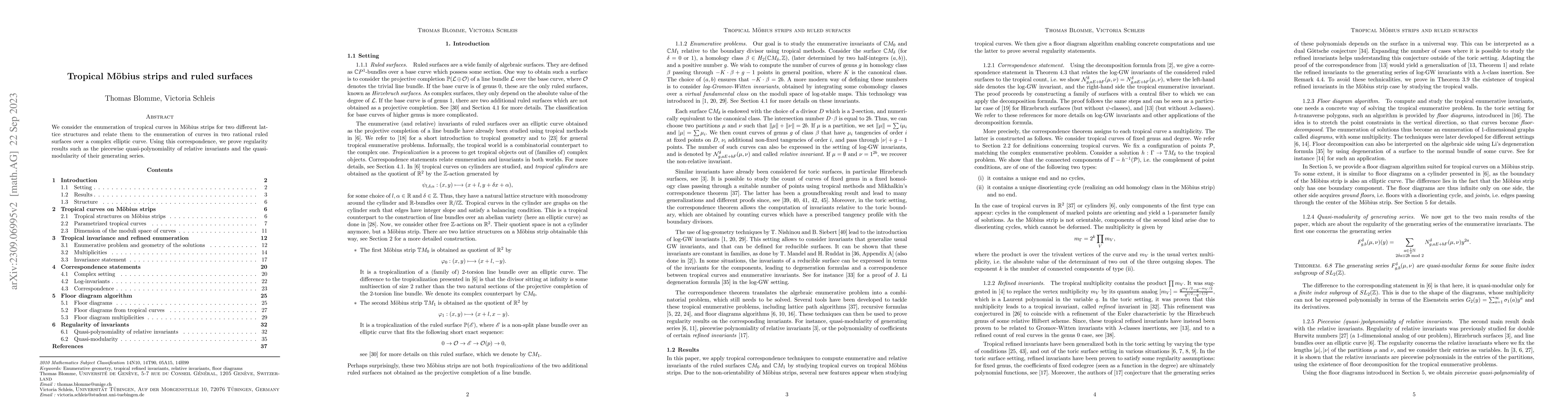 Summary: The paper enumerates tropical curves in Möbius strips for two lattice structures and connects this enumeration to rational ruled surfaces over complex elliptic curves, proving piecewise quasi-polynomiality and quasi-modularity of relative invariants and generating series.