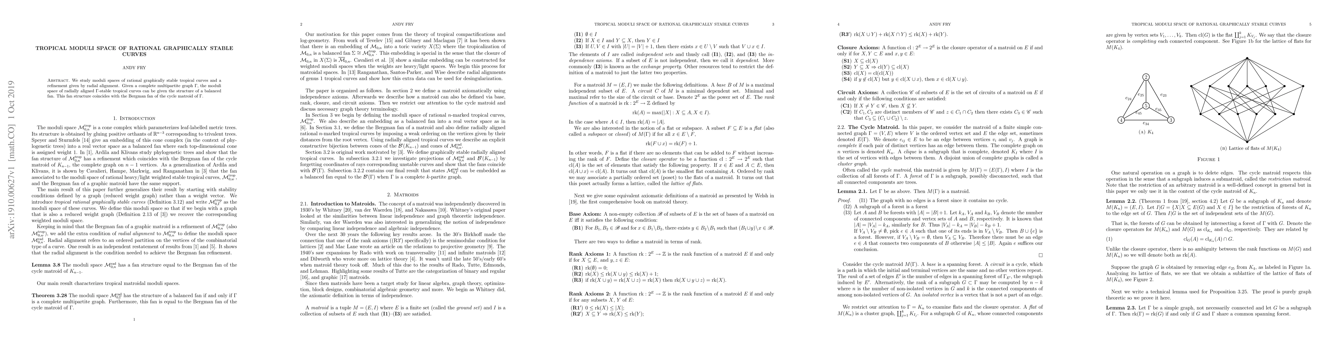 This paper investigates the moduli space of rational graphically stable tropical curves, presenting a refinement through radial alignment. The moduli space of $\Gamma$-stable tropical curves, given a complete multipartite graph $\Gamma$, is structured as a balanced fan, which aligns with the Bergman fan of the cycle matroid of $\Gamma$.