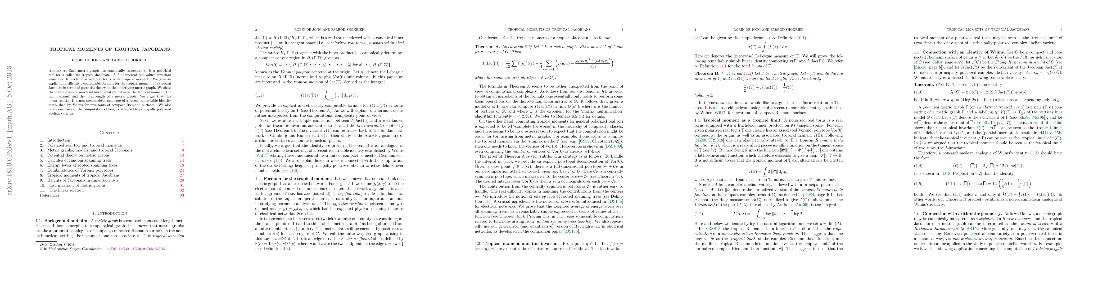 Each metric graph has canonically associated to it a polarized real torus called its tropical Jacobian. A fundamental real-valued invariant associated to each polarized real torus is its tropical moment. We give an explicit and efficiently computable formula for the tropical moment of a tropical Jacobian in terms of potential theory on the underlying metric graph. We show that there exists a universal linear relation between the tropical moment, the tau invariant, and the total length of a metric graph. We argue that this linear relation is a non-archimedean analogue of a recent remarkable identity established by Wilms for invariants of compact Riemann surfaces. We also relate our work to the computation of heights attached to principally polarized abelian varieties.