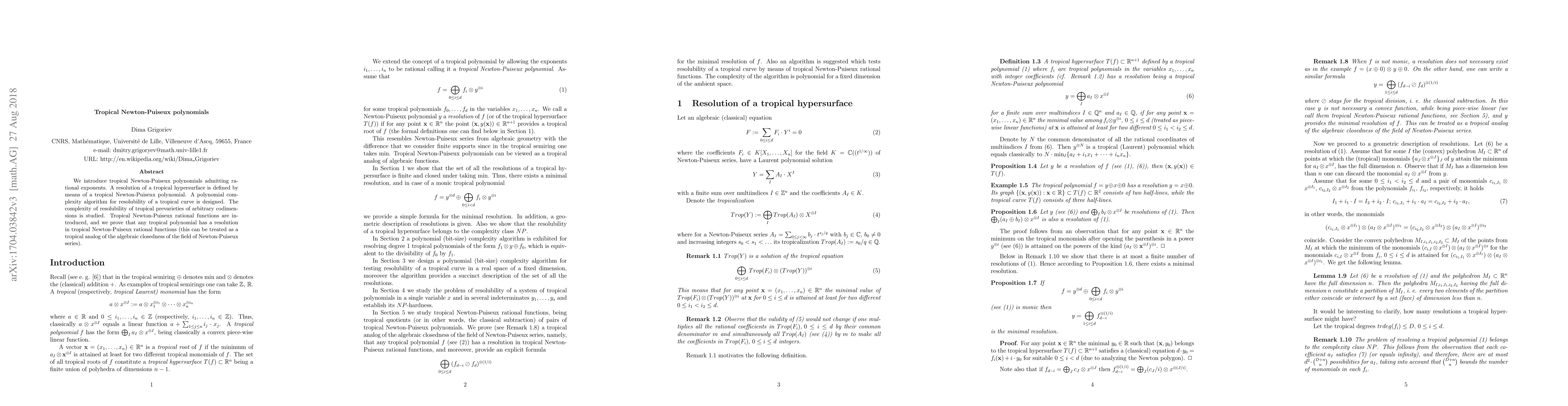 We introduce tropical Newton-Puiseux polynomials admitting rational exponents. A resolution of a tropical hypersurface is defined by means of a tropical Newton-Puiseux polynomial. A polynomial complexity algorithm for resolubility of a tropical curve is designed. The complexity of resolubility of tropical prevarieties of arbitrary codimensions is studied. Tropical Newton-Puiseux rational functions are introduced, and we prove that any tropical polynomial has a resolution in tropical Newton-Puiseux rational functions (this can be treated as a tropical analog of the algebraic closedness of the field of Newton-Puiseux series).