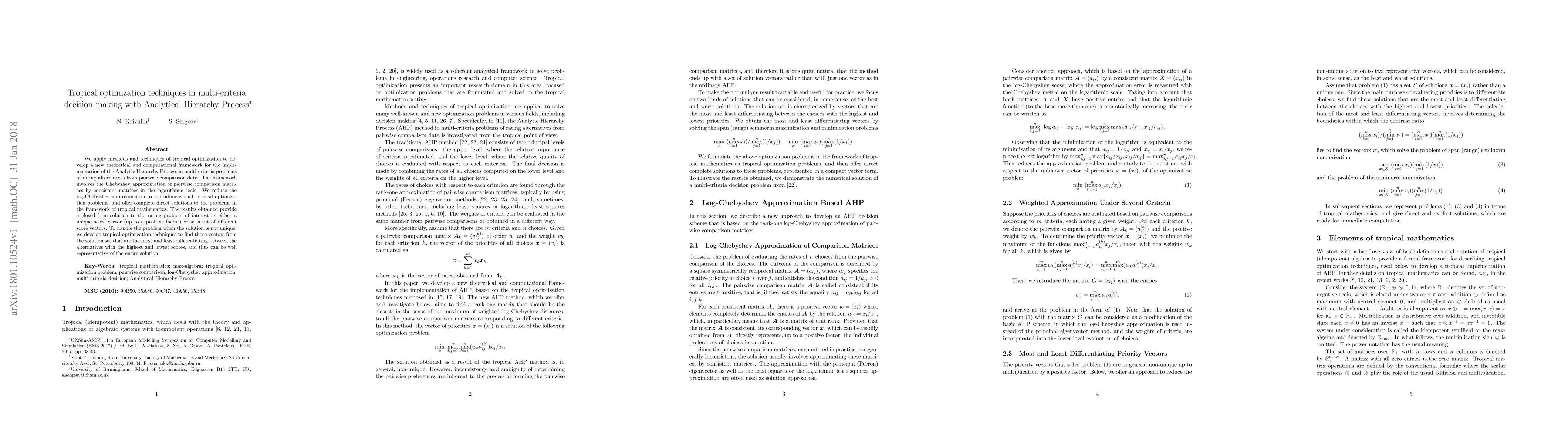 This paper introduces a new framework for multi-criteria decision making using tropical optimization and the Analytic Hierarchy Process (AHP). It provides a closed-form solution for rating alternatives through multidimensional tropical optimization and handles non-unique solutions by identifying the most and least differentiating score vectors.