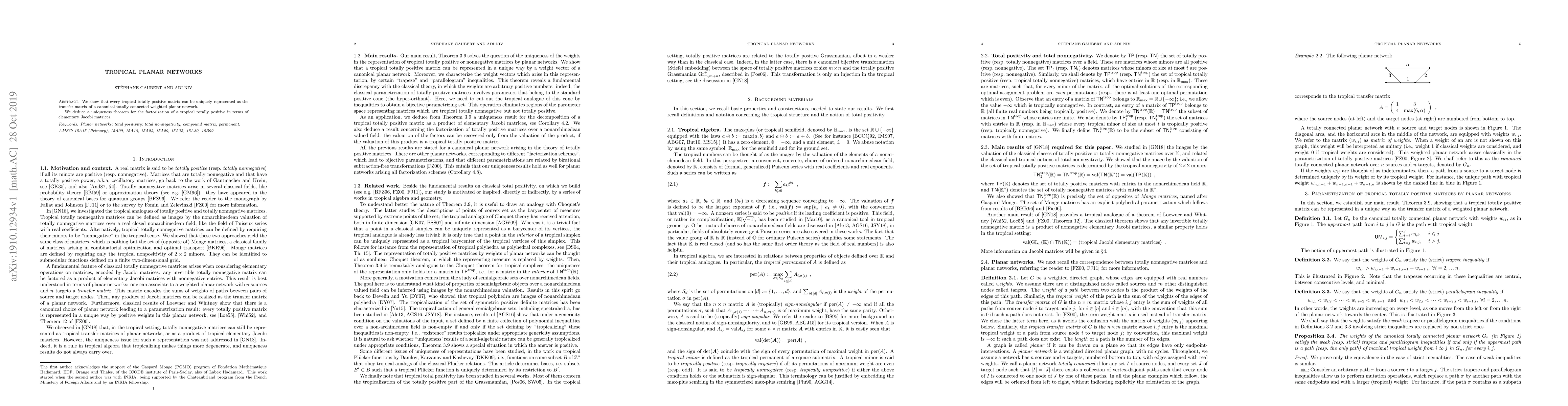 Summary: This paper demonstrates that every tropical totally positive matrix corresponds uniquely to the transfer matrix of a canonical totally connected weighted planar network, leading to a uniqueness theorem for the factorization of such matrices using elementary Jacobi matrices.