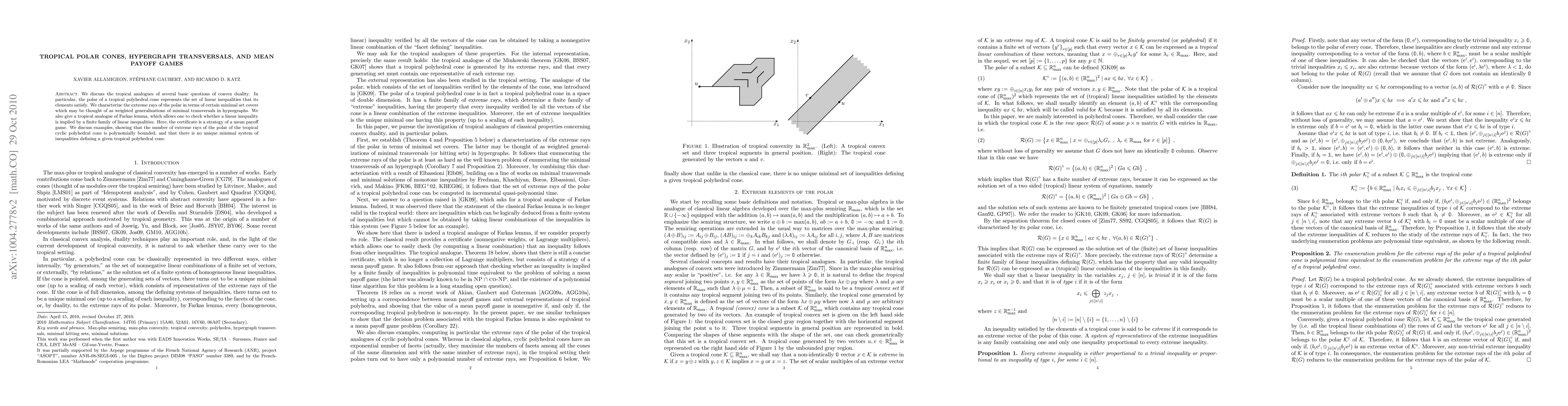 The paper explores tropical analogues of convex duality concepts, including characterizing extreme rays of polar cones in terms of minimal set covers and providing a tropical analogue of Farkas lemma using mean payoff games.