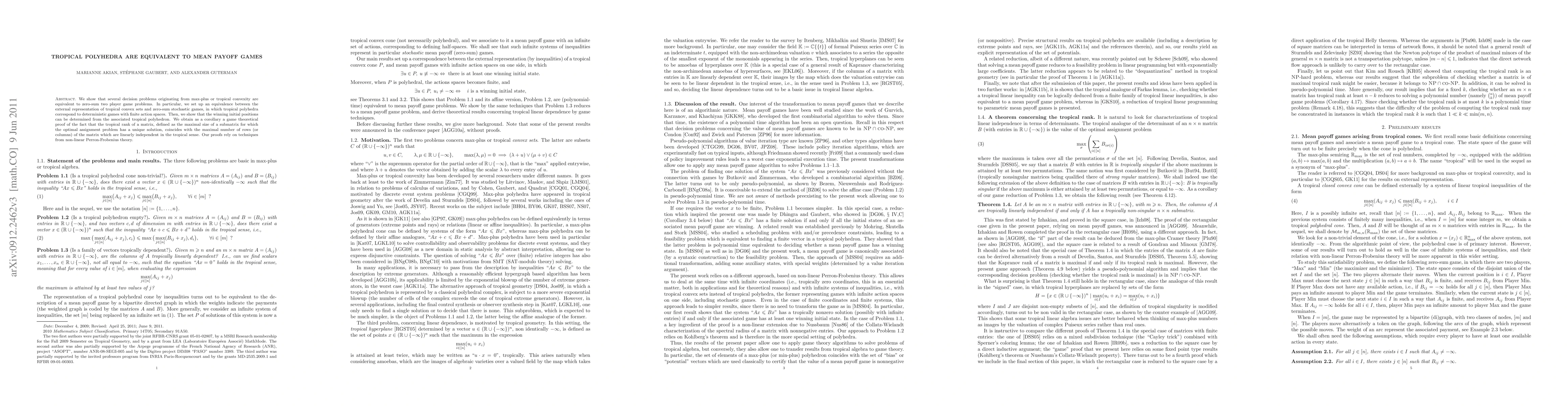 This paper establishes an equivalence between tropical polyhedra and zero-sum two-player mean payoff games, demonstrating that decision problems from tropical convexity can be framed as game problems. The study also proves that the tropical rank of a matrix corresponds to the maximal linearly independent rows or columns in the tropical sense, using techniques from non-linear Perron-Frobenius theory.