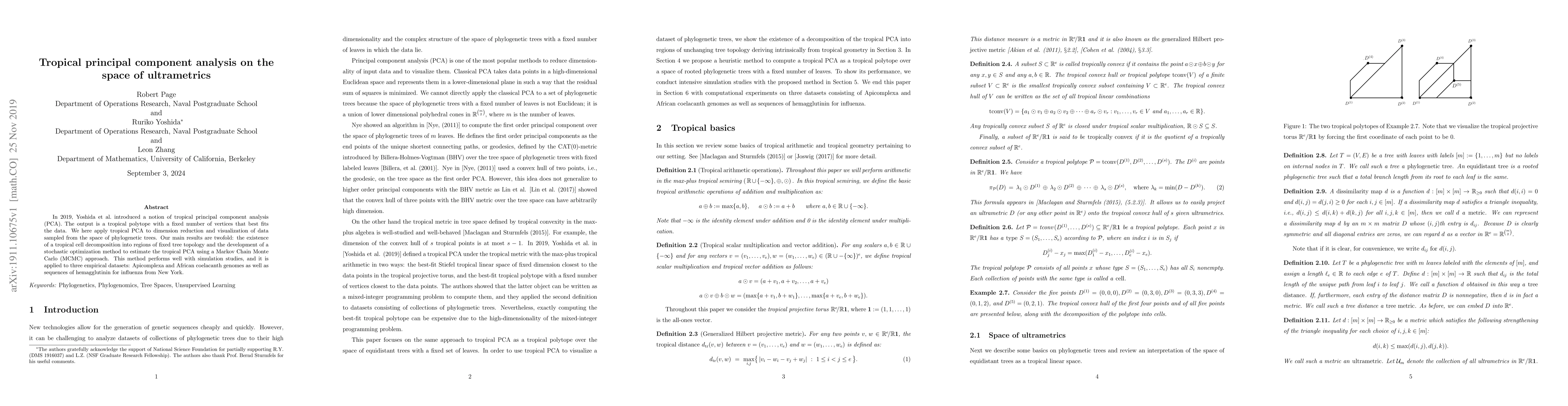 In 2019, Yoshida et al. introduced a notion of tropical principal component analysis (PCA). The output is a tropical polytope with a fixed number of vertices that best fits the data. We here apply tropical PCA to dimension reduction and visualization of data sampled from the space of phylogenetic trees. Our main results are twofold: the existence of a tropical cell decomposition into regions of fixed tree topology and the development of a stochastic optimization method to estimate the tropical PCA using a Markov Chain Monte Carlo (MCMC) approach. This method performs well with simulation studies, and it is applied to three empirical datasets: Apicomplexa and African coelacanth genomes as well as sequences of hemagglutinin for influenza from New York.