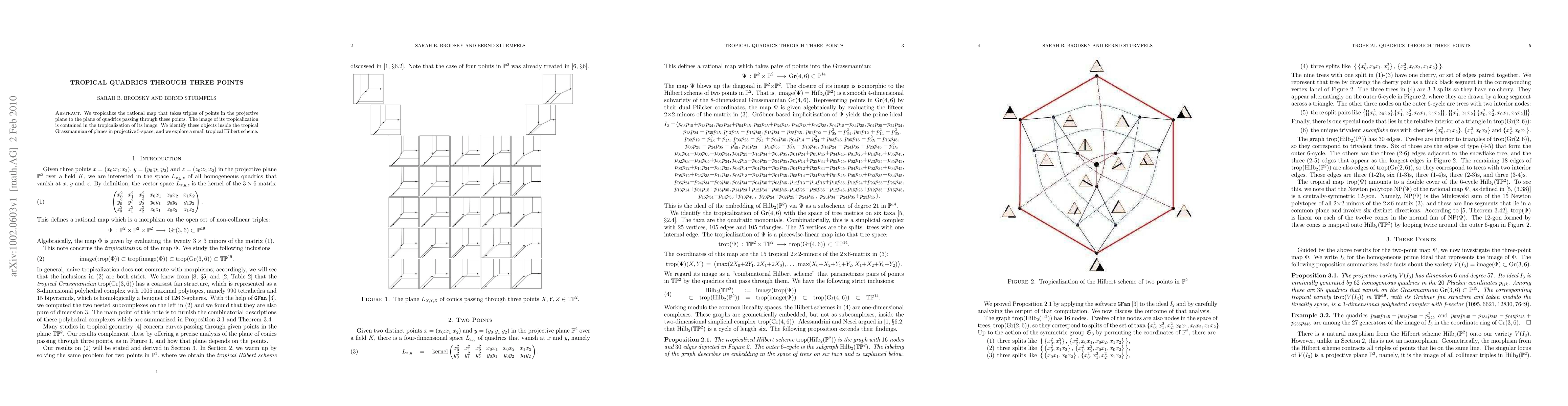 We tropicalize the rational map that takes triples of points in the projective plane to the plane of quadrics passing through these points. The image of its tropicalization is contained in the tropicalization of its image. We identify these objects inside the tropical Grassmannian of planes in projective 5-space, and we explore a small tropical Hilbert scheme.