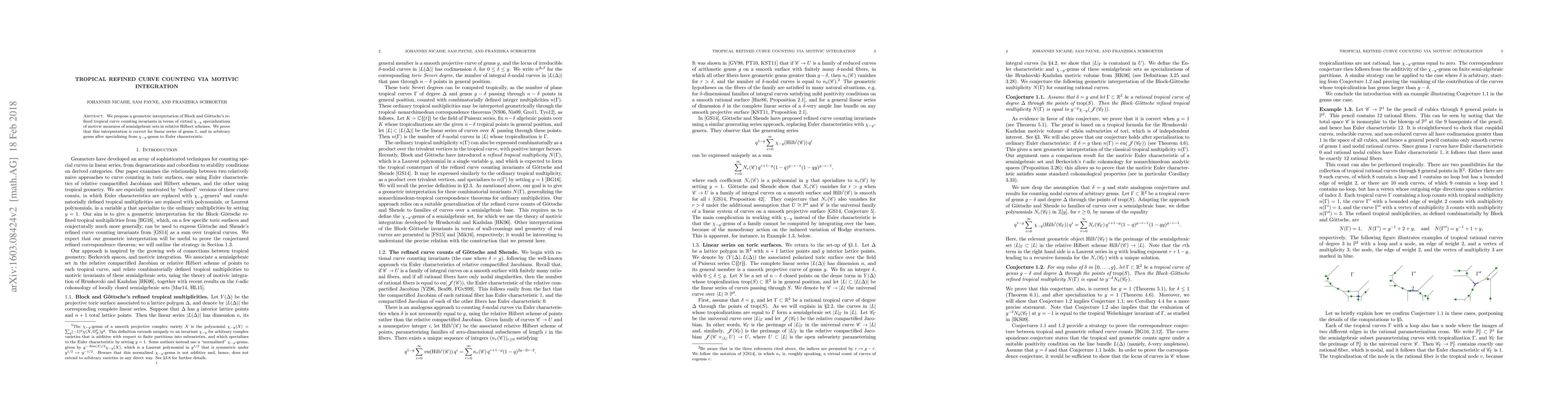 This paper interprets Block and Götsche's refined tropical curve counting invariants using motivic integration in relative Hilbert schemes, proving its correctness for genus 1 and through specialization for arbitrary genus.