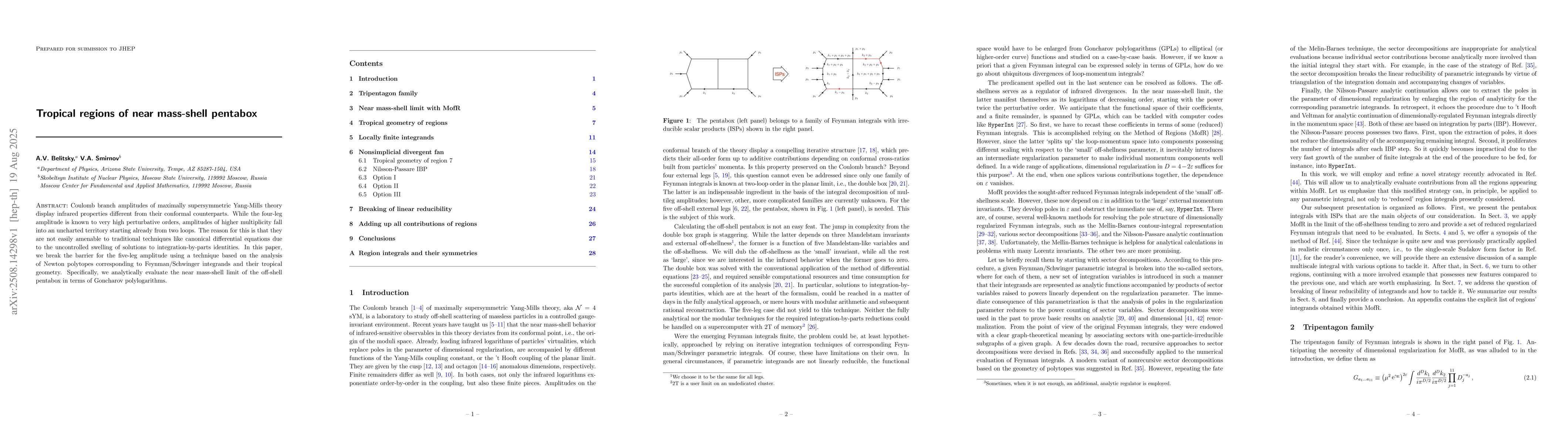 Coulomb branch amplitudes of maximally supersymmetric Yang-Mills theory display infrared properties different from their conformal counterparts. While the four-leg amplitude is known to very high perturbative orders, amplitudes of higher multiplicity fall into an uncharted territory starting already from two loops. The reason for this is that they are not easily amenable to traditional techniques like canonical differential equations due to the uncontrolled swelling of solutions to integration-by-parts identities. In this paper, we break the barrier for the five-leg amplitude using a technique based on the analysis of Newton polytopes corresponding to Feynman/Schwinger integrands and their tropical geometry. Specifically, we analytically evaluate the near mass-shell limit of the off-shell pentabox in terms of Goncharov polylogarithms.