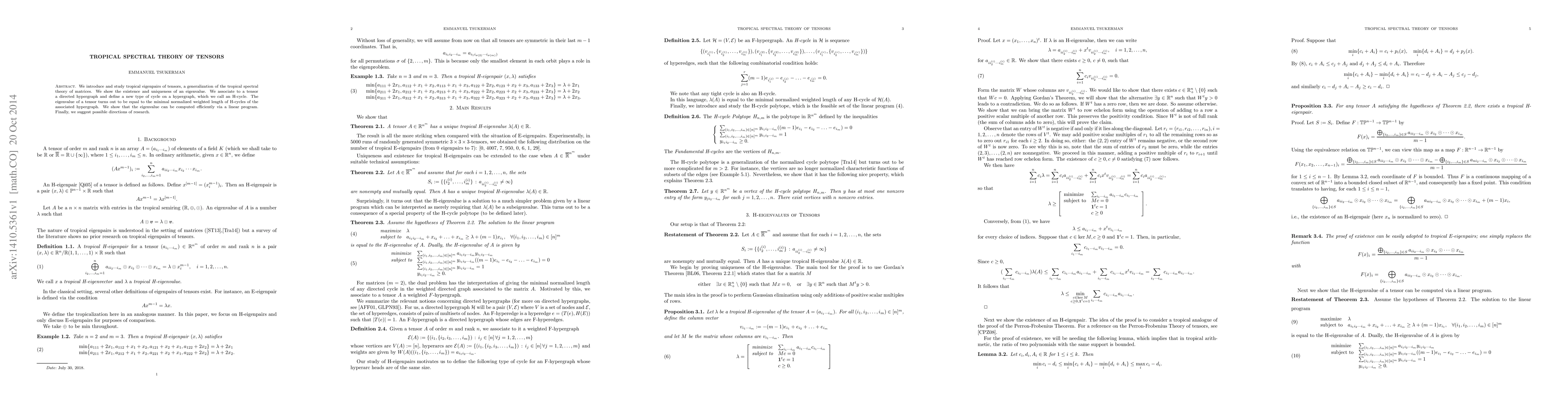 We introduce and study tropical eigenpairs of tensors, a generalization of the tropical spectral theory of matrices. We show the existence and uniqueness of an eigenvalue. We associate to a tensor a directed hypergraph and define a new type of cycle on a hypergraph, which we call an H-cycle. The eigenvalue of a tensor turns out to be equal to the minimal normalized weighted length of H-cycles of the associated hypergraph. We show that the eigenvalue can be computed efficiently via a linear program. Finally, we suggest possible directions of research.