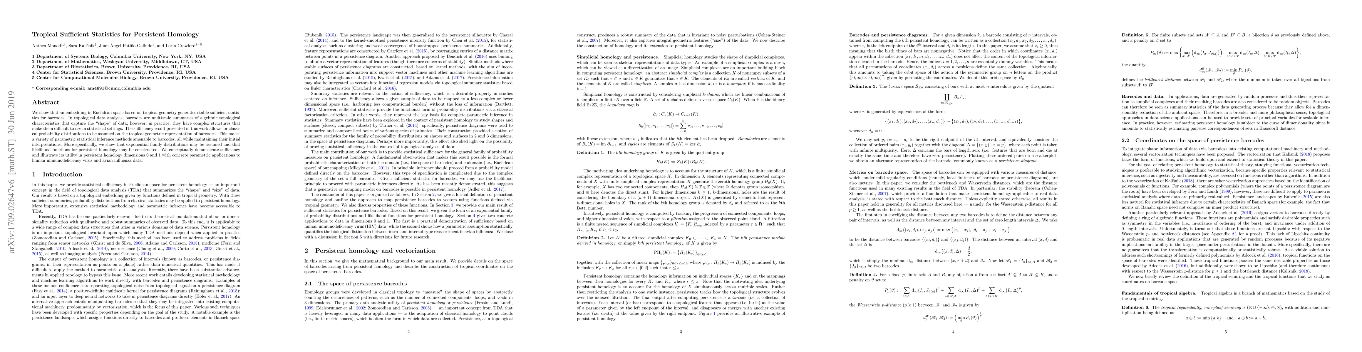 We show that an embedding in Euclidean space based on tropical geometry generates stable sufficient statistics for barcodes. In topological data analysis, barcodes are multiscale summaries of algebraic topological characteristics that capture the `shape' of data; however, in practice, they have complex structures that make them difficult to use in statistical settings. The sufficiency result presented in this work allows for classical probability distributions to be assumed on the tropical geometric representation of barcodes. This makes a variety of parametric statistical inference methods amenable to barcodes, all while maintaining their initial interpretations. More specifically, we show that exponential family distributions may be assumed, and that likelihood functions for persistent homology may be constructed. We conceptually demonstrate sufficiency and illustrate its utility in persistent homology dimensions 0 and 1 with concrete parametric applications to human immunodeficiency virus and avian influenza data.