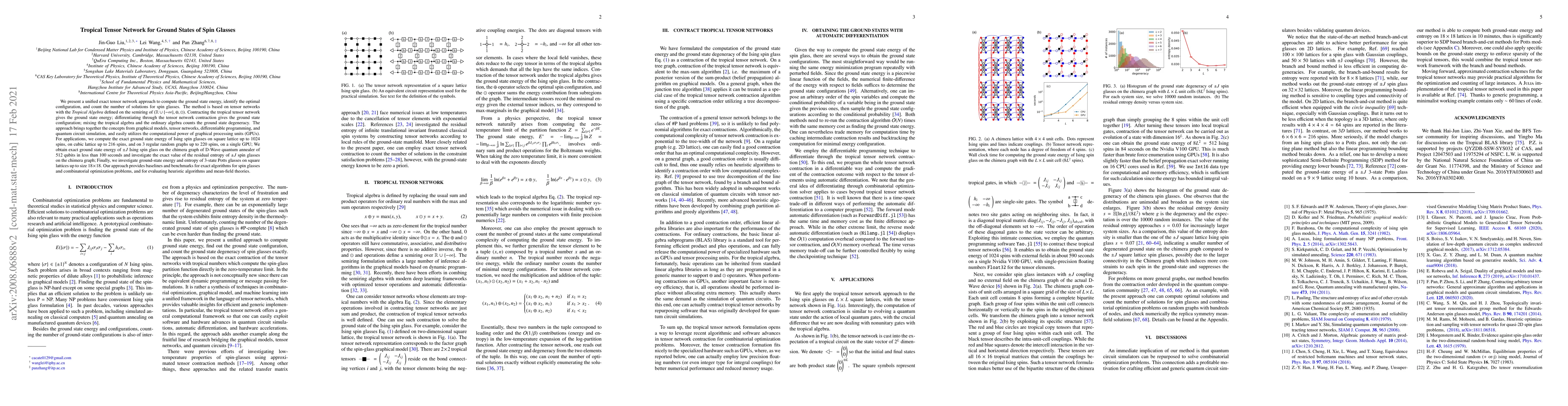 This paper introduces a tensor network approach using Tropical Algebra to compute ground state properties of spin glasses, achieving exact results for Ising and Potts models on various lattices and graphs. The method leverages GPU computation to handle large-scale problems efficiently, providing benchmarks for exact and heuristic algorithms.