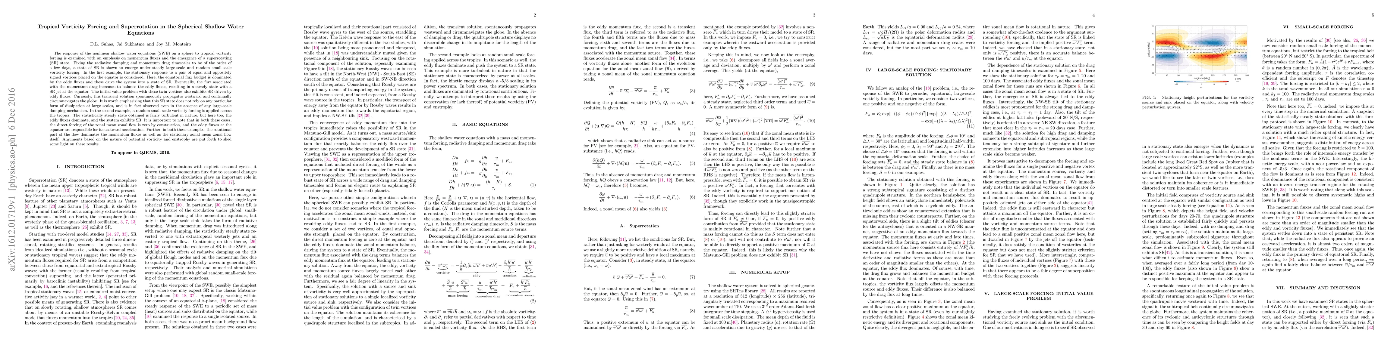 This paper investigates the emergence of superrotation in the spherical shallow water equations under tropical vorticity forcing, showing that eddy fluxes drive the system into a steady superrotating state, even without large-scale damping. Both large-scale vortex pairs and random small-scale forcing lead to a superrotating jet, highlighting the dominance of rotational flow components.