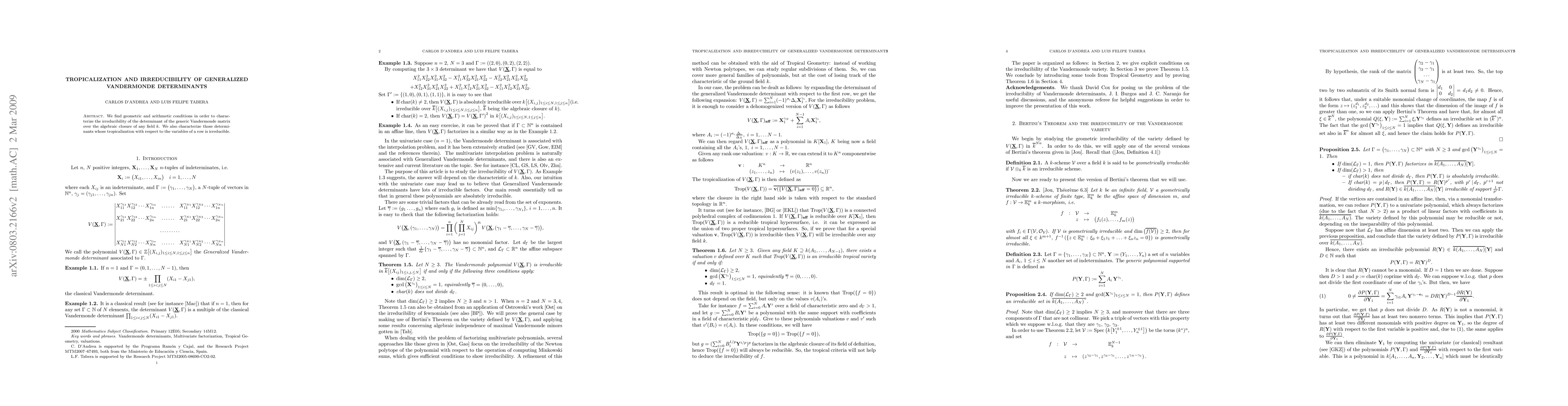 Summary: This paper identifies geometric and arithmetic criteria for determining the irreducibility of generalized Vandermonde determinants over algebraic closures of fields. Additionally, it explores the conditions under which the tropicalization of these determinants remains irreducible.