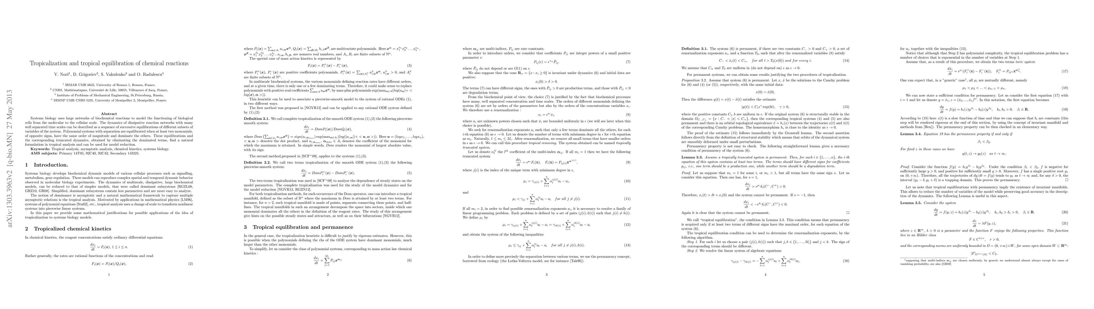 Systems biology uses large networks of biochemical reactions to model the functioning of biological cells from the molecular to the cellular scale. The dynamics of dissipative reaction networks with many well separated time scales can be described as a sequence of successive equilibrations of different subsets of variables of the system. Polynomial systems with separation are equilibrated when at least two monomials, of opposite signs, have the same order of magnitude and dominate the others. These equilibrations and the corresponding truncated dynamics, obtained by eliminating the dominated terms, find a natural formulation in tropical analysis and can be used for model reduction.