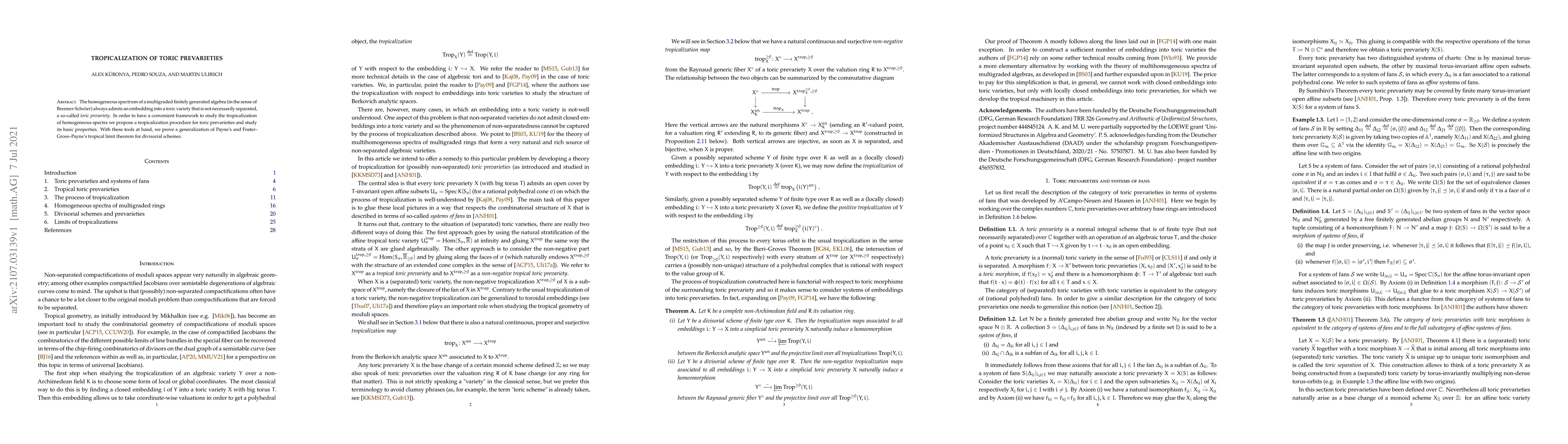 The homogeneous spectrum of a multigraded finitely generated algebra (in the sense of Brenner-Schr\"oer) always admits an embedding into a toric variety that is not necessarily separated, a so-called toric prevariety. In order to have a convenient framework to study the tropicalization of homogeneous spectra we propose a tropicalization procedure for toric prevarieties and study its basic properties. With these tools at hand, we prove a generalization of Payne's and Foster--Gross--Payne's tropical limit theorem for divisorial schemes.
