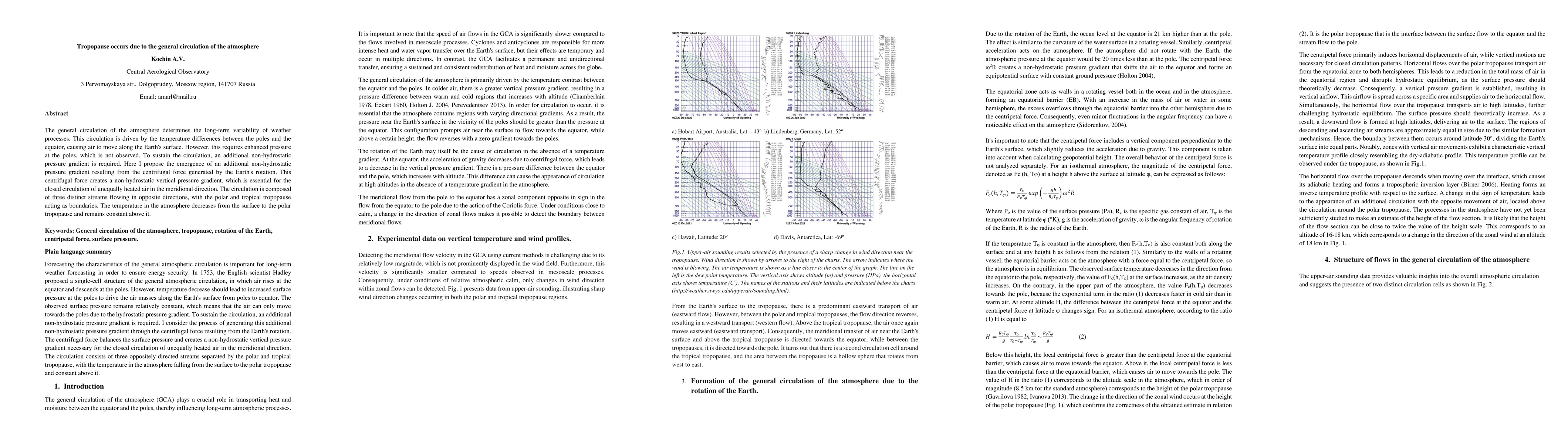 The general circulation of the atmosphere determines the long-term variability of weather processes. This circulation is driven by the temperature differences between the poles and the equator, causing air to move along the Earth's surface. However, this requires enhanced pressure at the poles, which is not observed. To sustain the circulation, an additional non-hydrostatic pressure gradient is required. Here I propose the emergence of an additional non-hydrostatic pressure gradient resulting from the centrifugal force generated by the Earth's rotation. This centrifugal force creates a non-hydrostatic vertical pressure gradient, which is essential for the closed circulation of unequally heated air in the meridional direction. The circulation is composed of three distinct streams flowing in opposite directions, with the polar and tropical tropopause acting as boundaries. The temperature in the atmosphere decreases from the surface to the polar tropopause and remains constant above it.