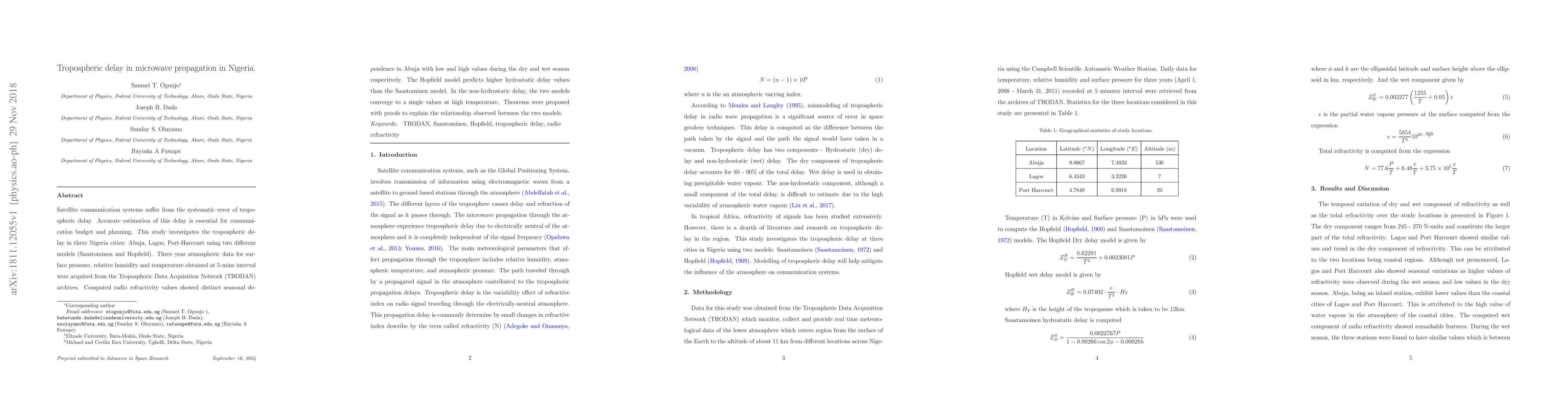 This study estimates tropospheric delay in satellite communication in three Nigerian cities using Saastominen and Hopfield models, revealing distinct seasonal variations in Abuja. The Hopfield model predicts higher hydrostatic delays, while both models converge at high temperatures.