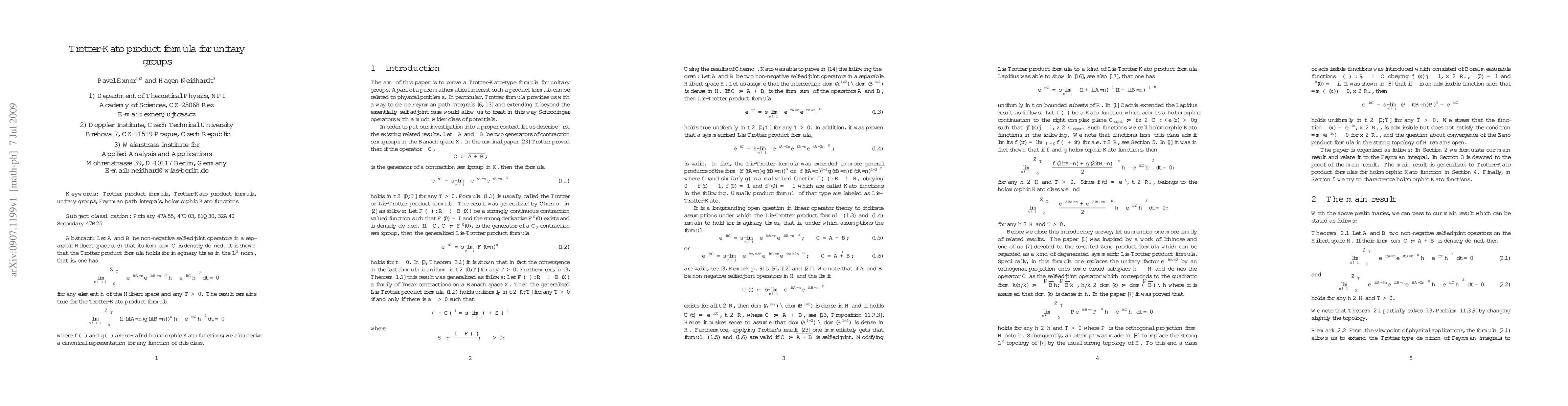 This paper establishes the Trotter product formula for unitary groups generated by non-negative self-adjoint operators, proving convergence in the $L^2$-norm for imaginary times. It also extends the result to the Trotter-Kato product formula involving holomorphic Kato functions, providing a canonical representation for such functions.