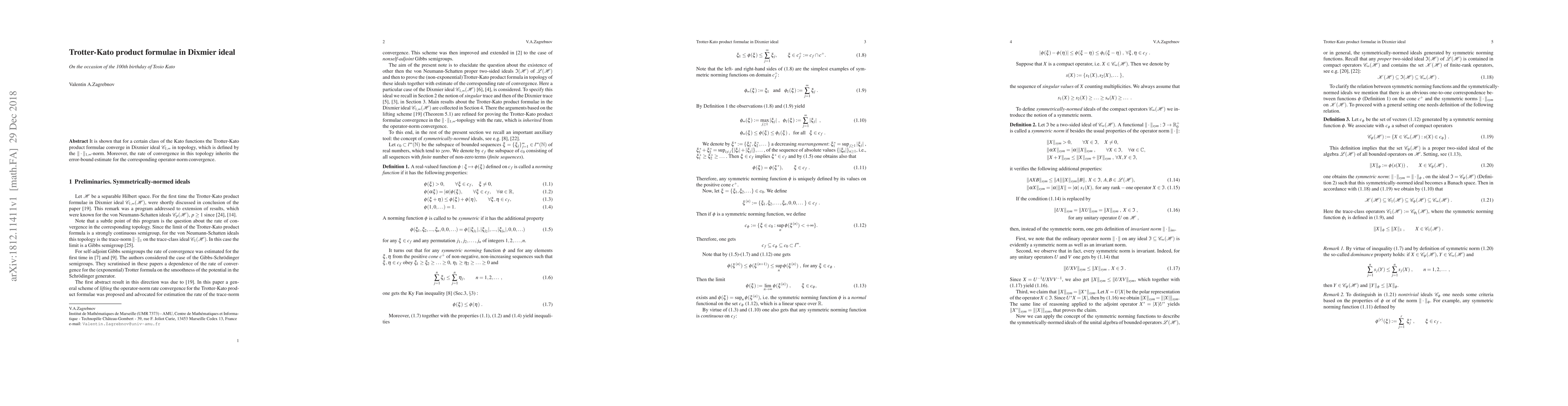 It is shown that for a certain class of the Kato functions the Trotter-Kato product formulae converge in Dixmier ideal C 1,$\infty$ in topology, which is defined by the $\times$ 1,$\infty$-norm. Moreover, the rate of convergence in this topology inherits the error-bound estimate for the corresponding operator-norm convergence. 1 since [24], [14]. Note that a subtle point of this program is the question about the rate of convergence in the corresponding topology. Since the limit of the Trotter-Kato product formula is a strongly continuous semigroup, for the von Neumann-Schatten ideals this topology is the trace-norm $\times$ 1 on the trace-class ideal C 1 (H). In this case the limit is a Gibbs semigroup [25]. For self-adjoint Gibbs semigroups the rate of convergence was estimated for the first time in [7] and [9]. The authors considered the case of the Gibbs-Schr{\"o}dinger semigroups. They scrutinised in these papers a dependence of the rate of convergence for the (exponential) Trotter formula on the smoothness of the potential in the Schr{\"o}dinger generator. The first abstract result in this direction was due to [19]. In this paper a general scheme of lifting the operator-norm rate convergence for the Trotter-Kato product formulae was proposed and advocated for estimation the rate of the trace-norm