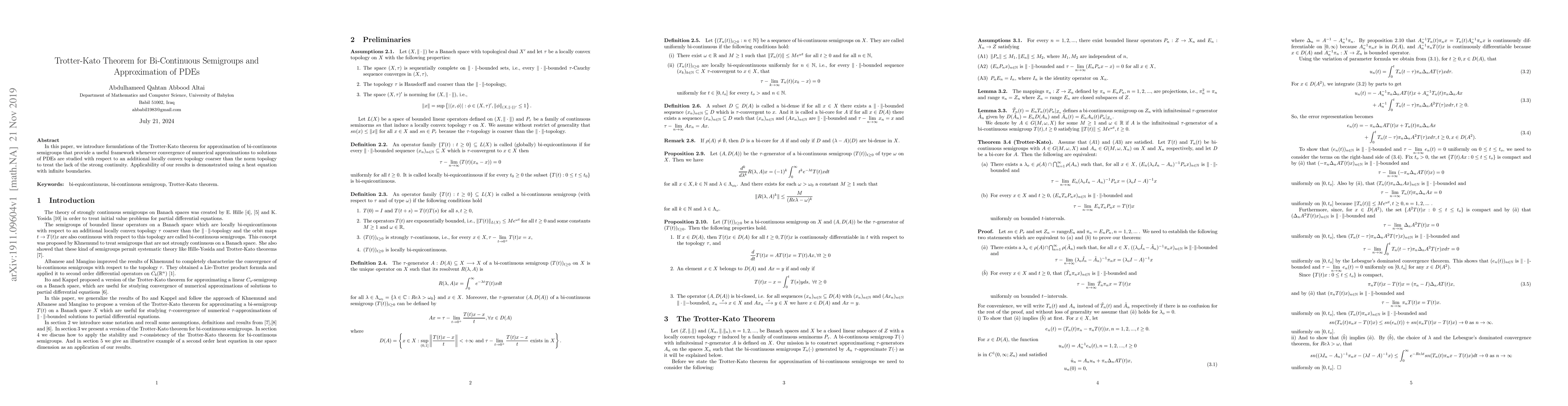 The paper presents a Trotter Kato theorem for bi continuous semigroups, offering a framework for studying convergence of numerical PDE approximations under a locally convex topology. The results are demonstrated through the analysis of a heat equation with infinite boundaries.