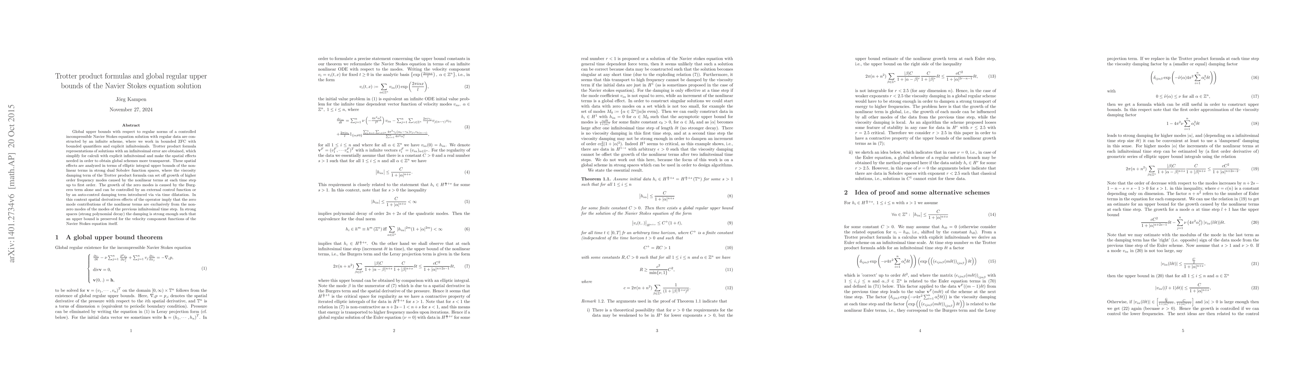 This paper establishes global upper bounds for the solution of the Navier-Stokes equation using Trotter product formulas with infinitesimal error, providing a simplified approach to analyzing spatial effects.