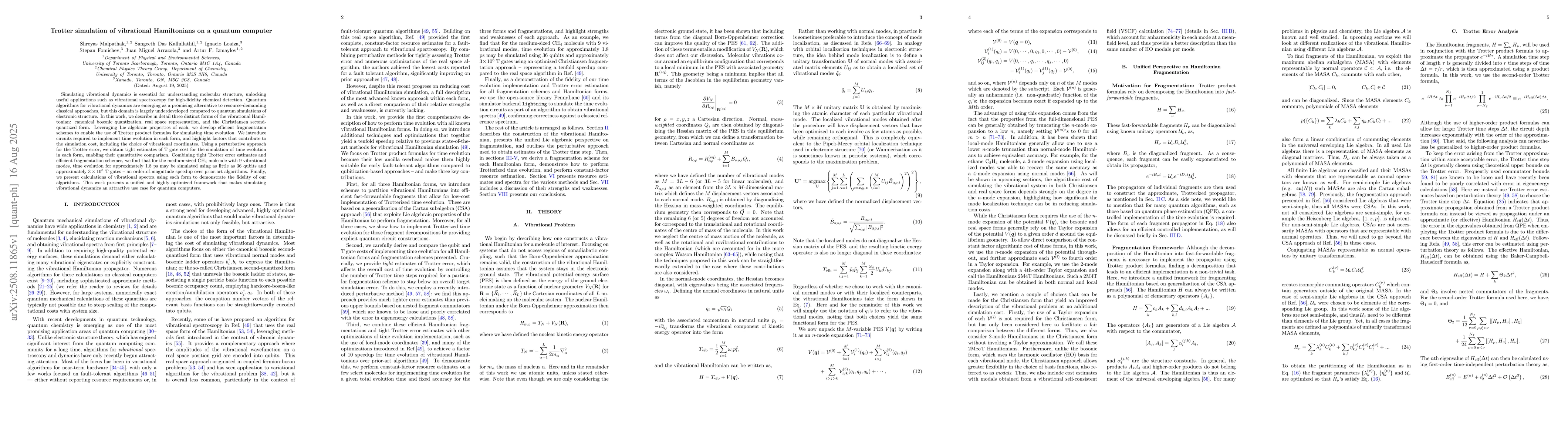 The paper introduces efficient fragmentation schemes and circuits for implementing time evolution in distinct forms of vibrational Hamiltonians, providing a comprehensive framework for simulating vibrational dynamics on quantum computers.