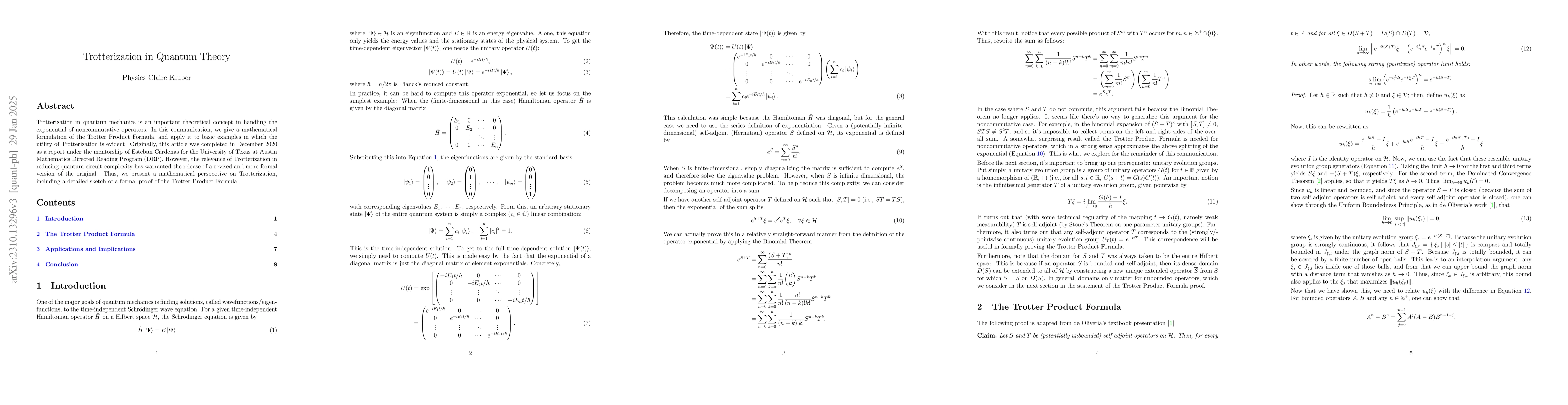 This paper provides a mathematical formulation of the Trotter Product Formula, a method for approximating the exponential of noncommutative operators in quantum mechanics, and demonstrates its utility through basic examples. The authors emphasize its relevance in reducing quantum circuit complexity and present a formal proof sketch.