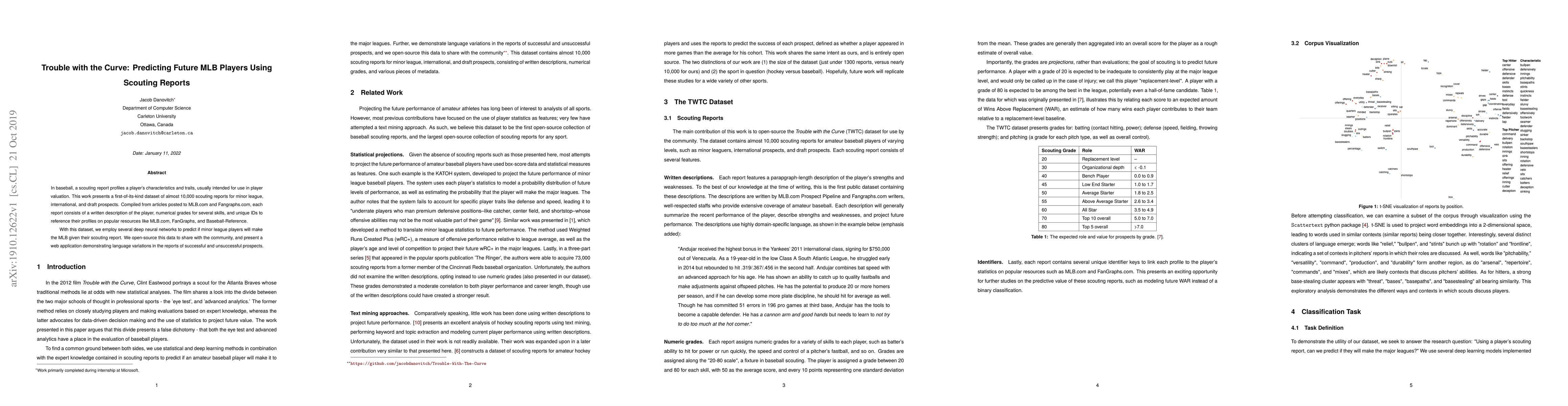 Researchers created a dataset of 10,000 scouting reports to predict future MLB players' success using deep neural networks. They open-sourced the data and developed a web application showcasing language variations in scouting reports between successful and unsuccessful prospects.